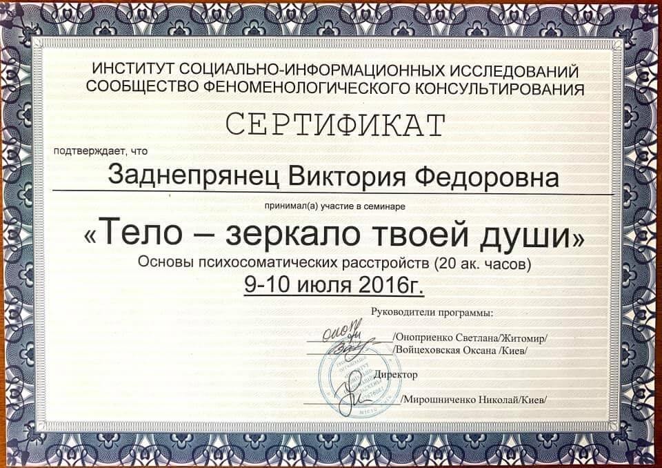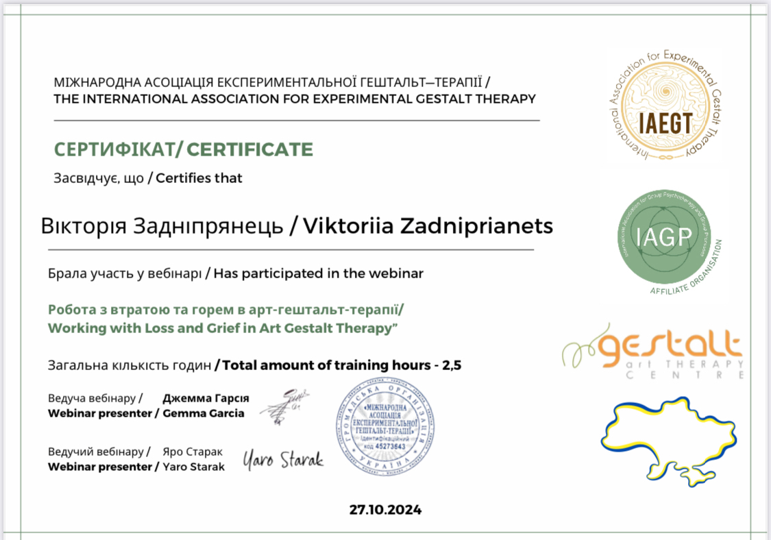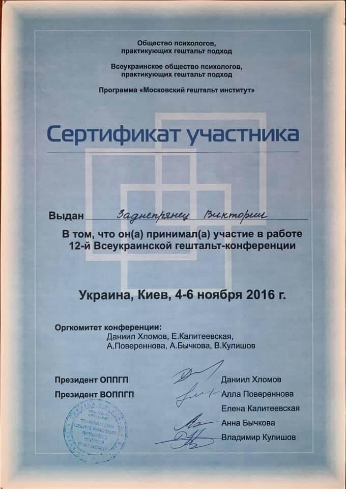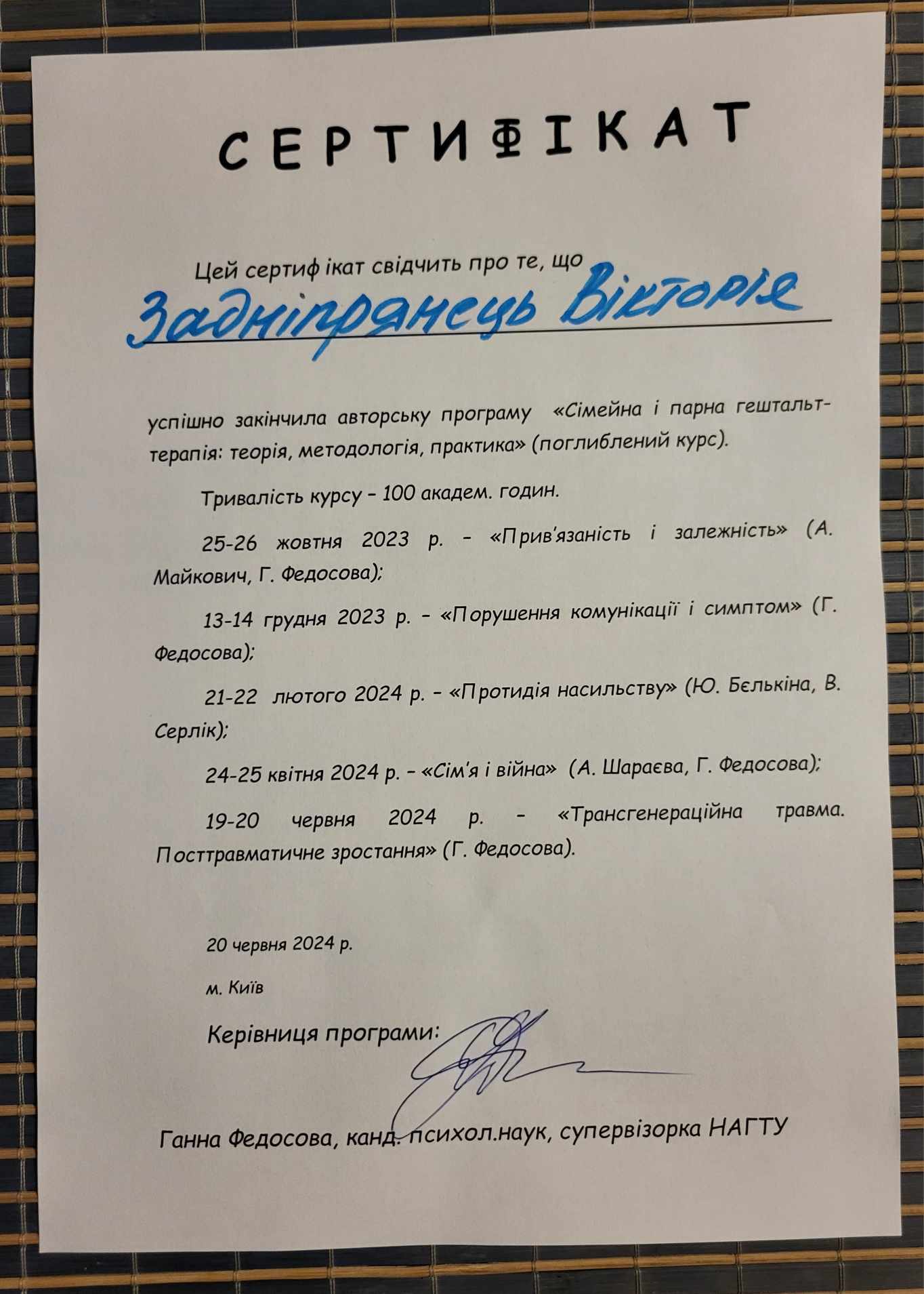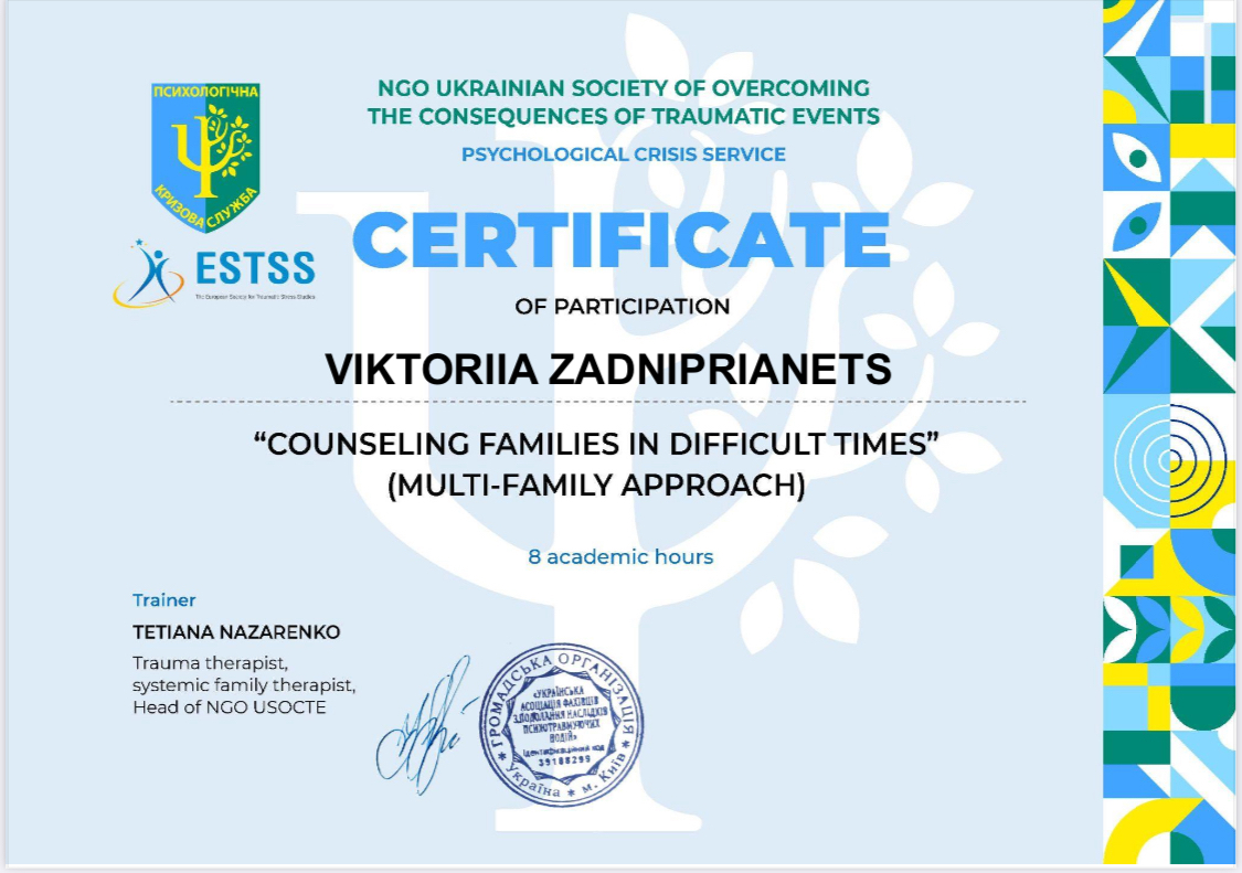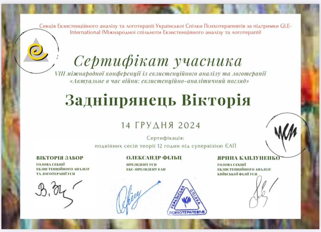 27 лет личной и групповой терапии. Теперь Живу Свою Жизнь, которая стала более качественной. Психотерапия помогла мне реализовывать мои мечты. Теперь я знаю, как помочь моим клиентам в темах, которые я уже проработала в собственной психотерапии.