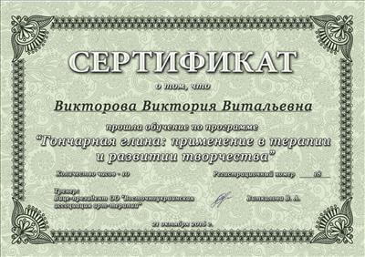 Специализация- " Работа с психосоматикой в гештальт подходе". "Возрастные кризисы в гештальтподходе". "Глинотерапия" Государственные курсы повышения квалификации по детской психотерапии и психокорекции детей и подростков". Третя ступень обучения- "Совершенствование в гештальт терапии".