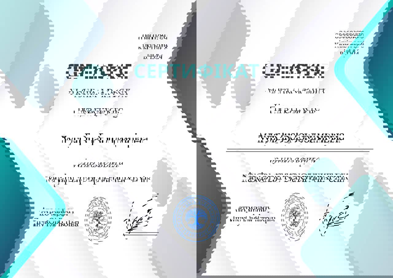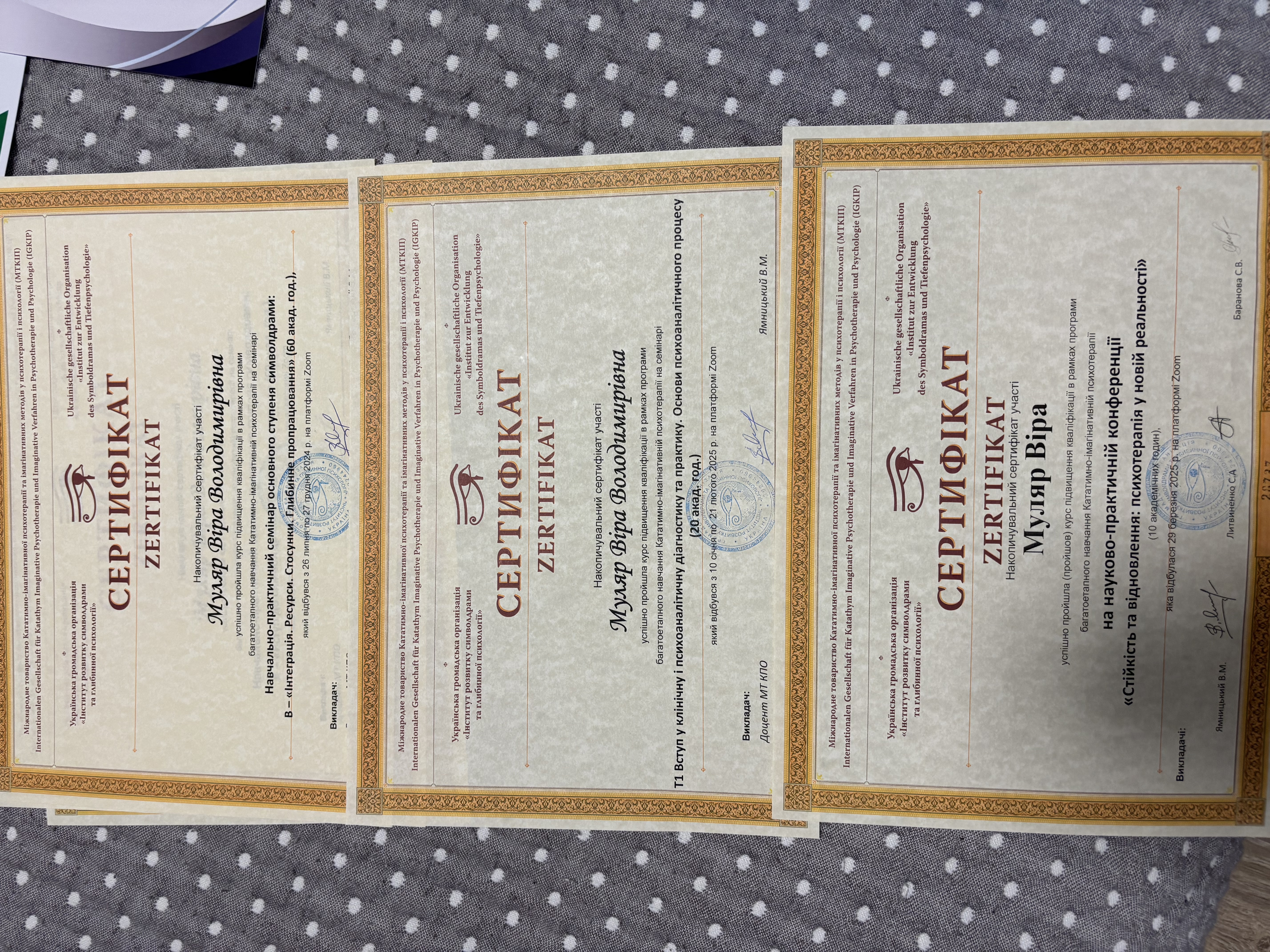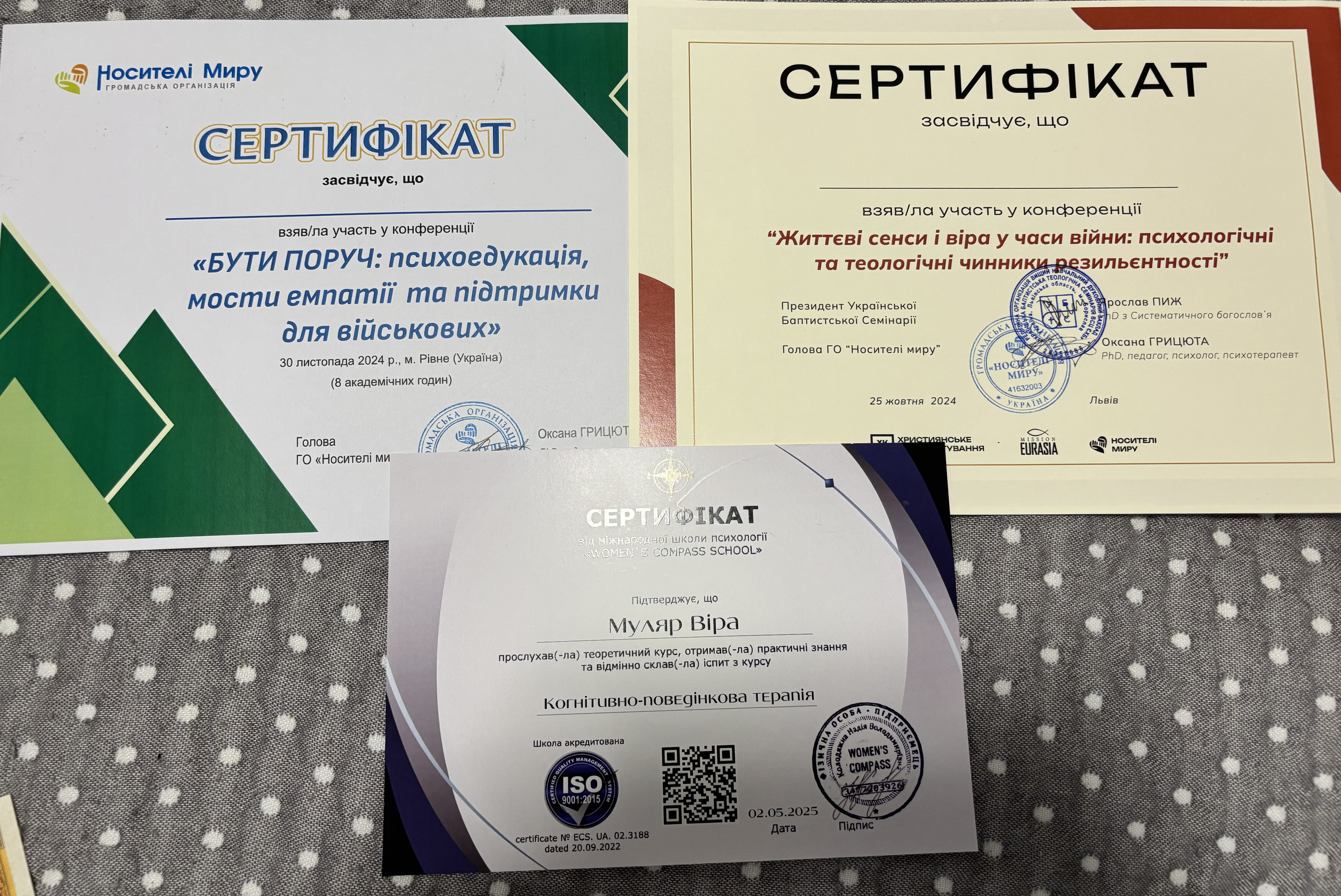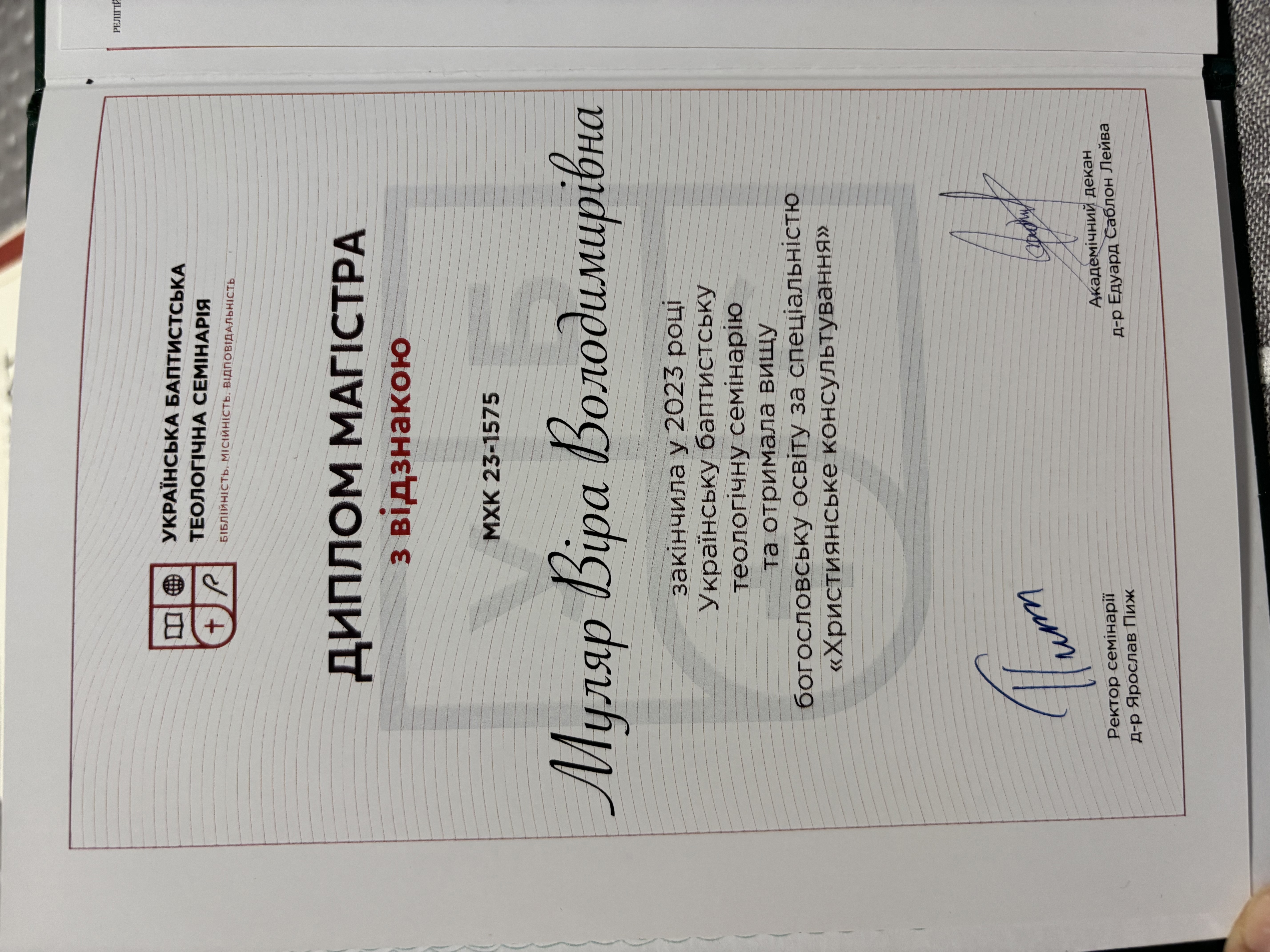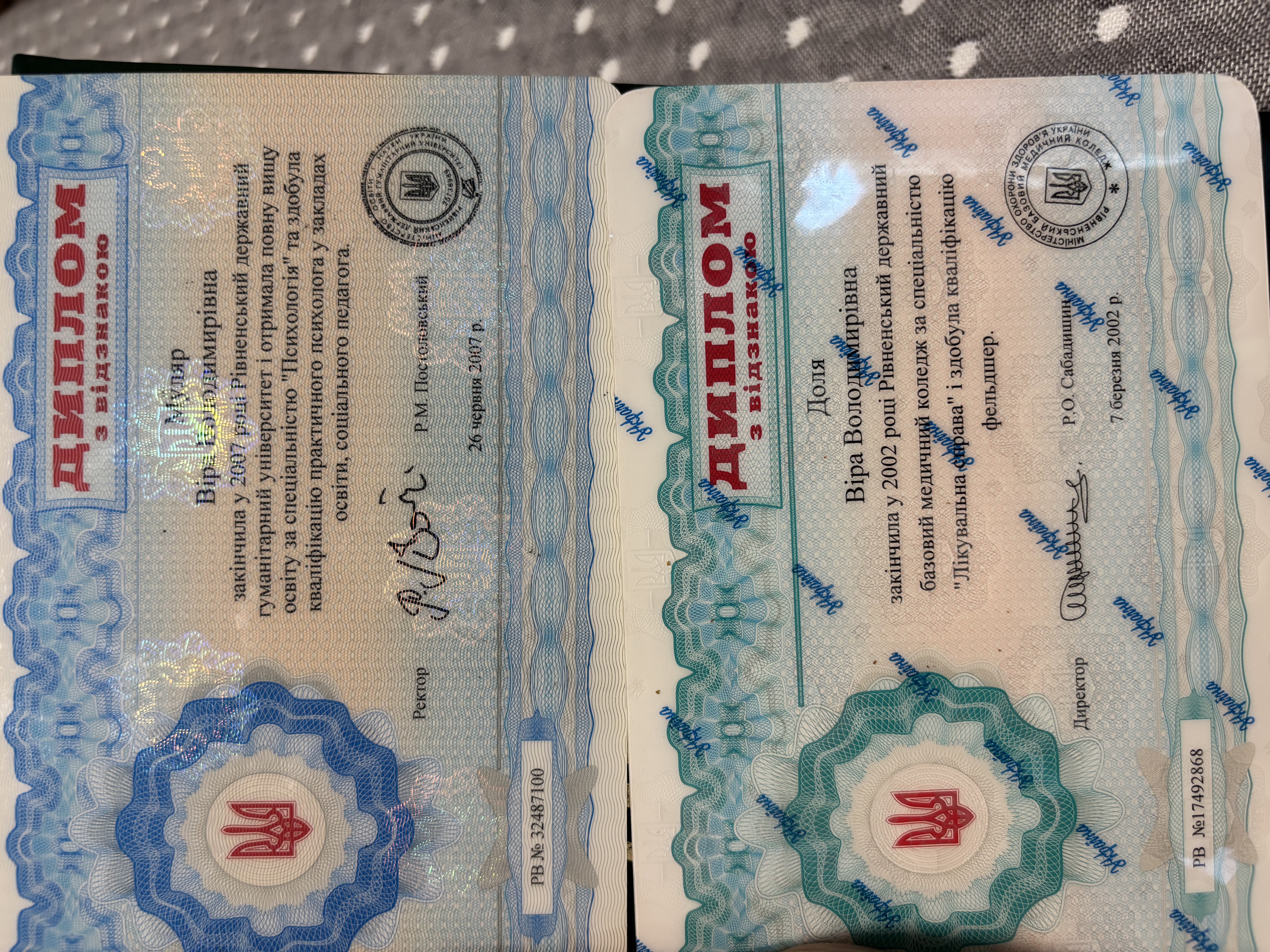 Ровенский государственный гуманитарный университет «Психология и социальная педагогика», Украинская баптистская теологическая семинария «Магистратура христианское консультирование», ИРСХП «Консультант по методу символдра», прослушала теоретически-практический курс по КПТ, сертификат по арт-терапии.