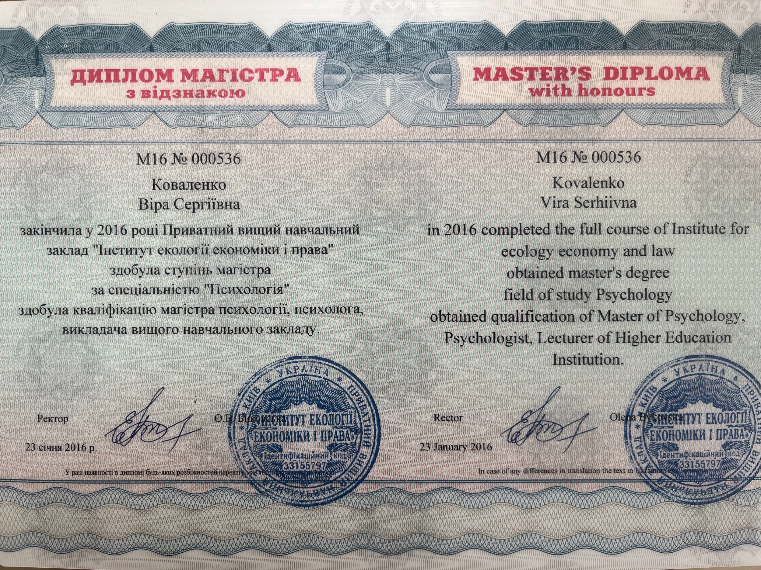 Институт экологии, экономики Магистр психологии, преподаватель высшего учебного заведения.