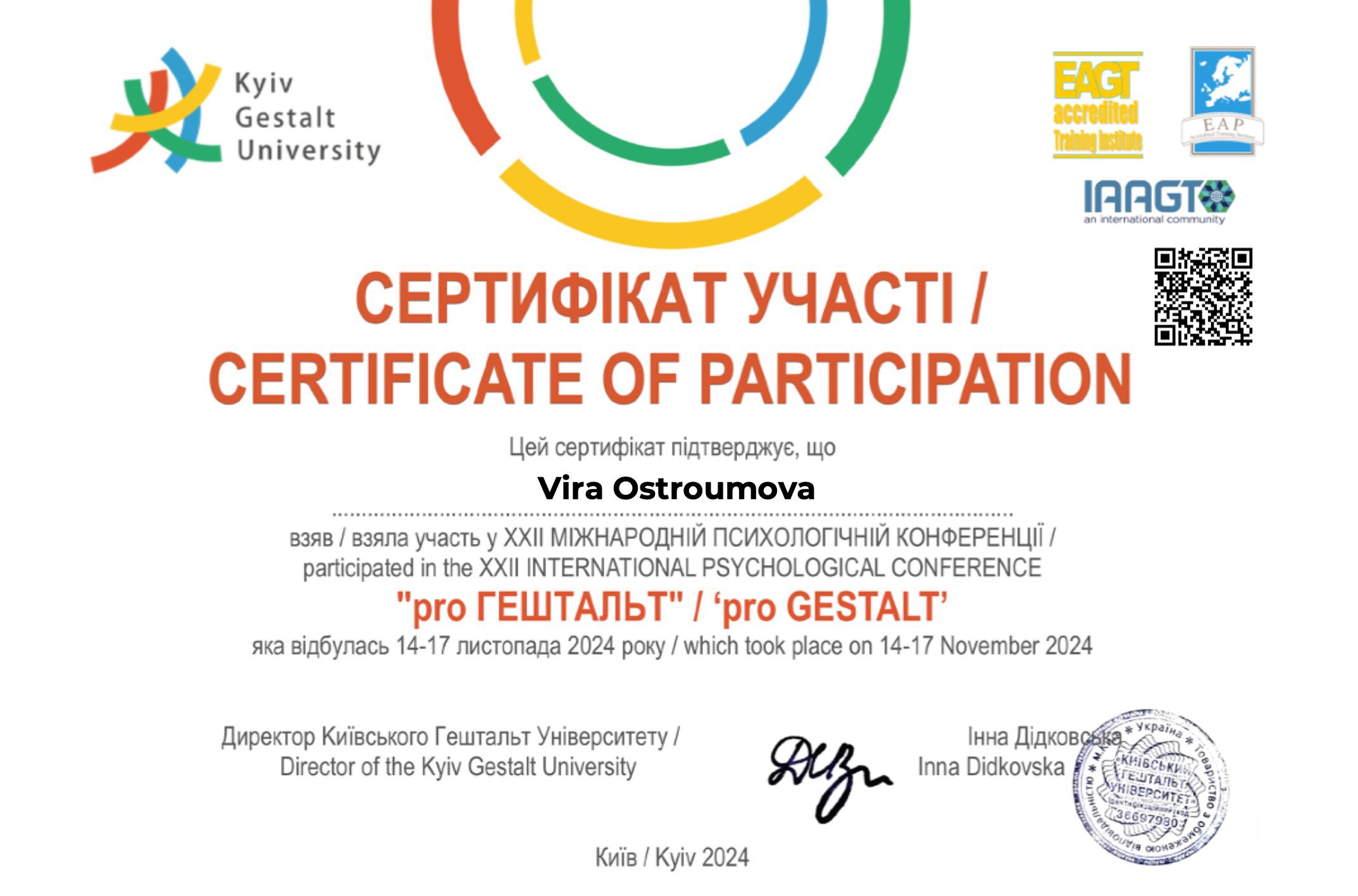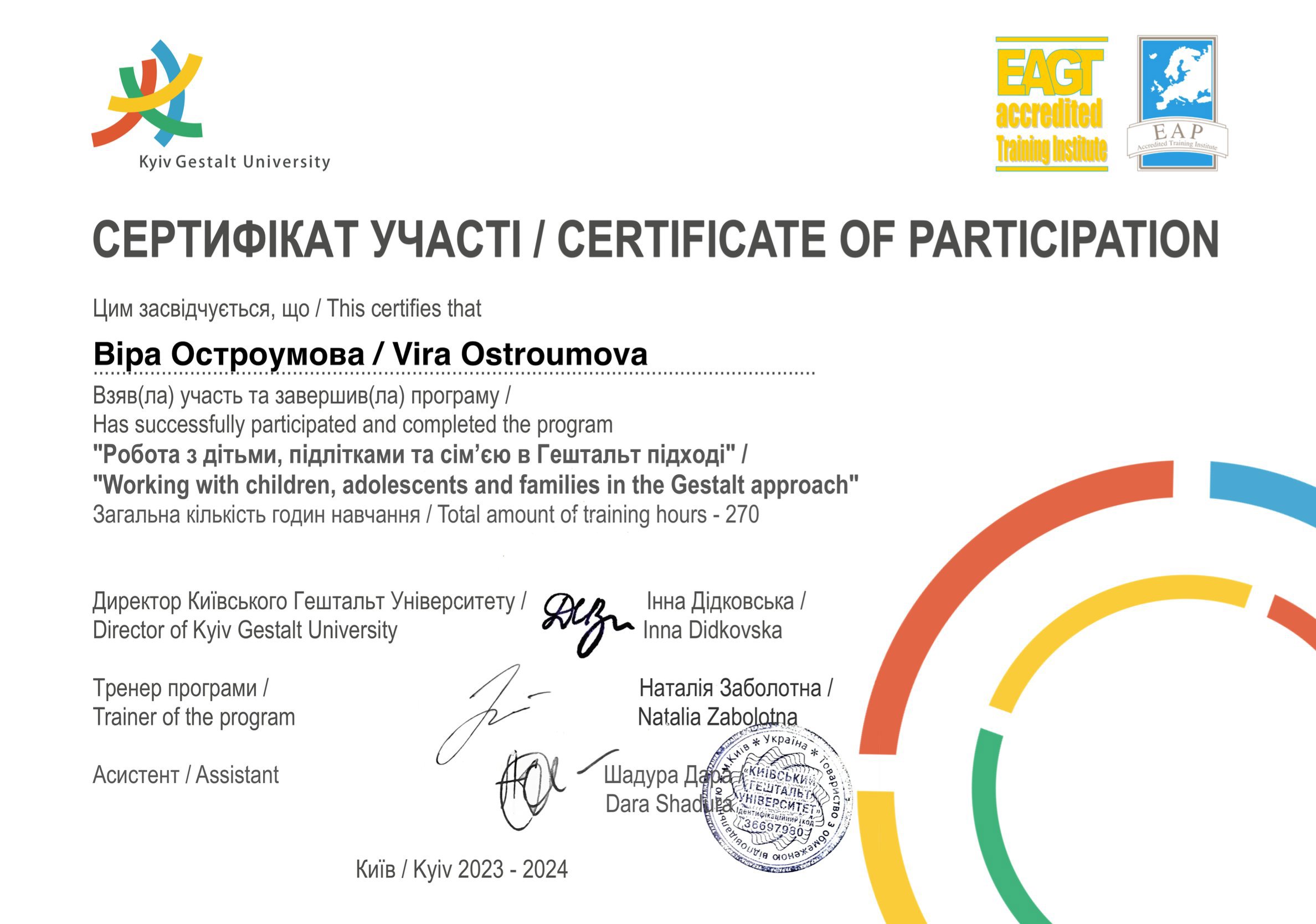 Киевский Гештальт Университет - 2 степень 528 часов( в процессе)