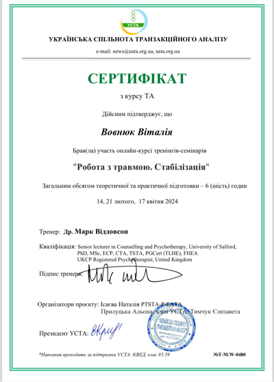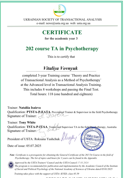 - 3 год обучения в Транзактном Анализе в Психотерапии;