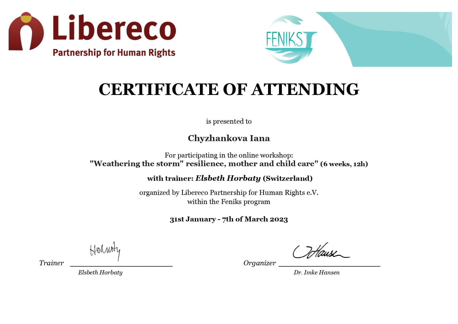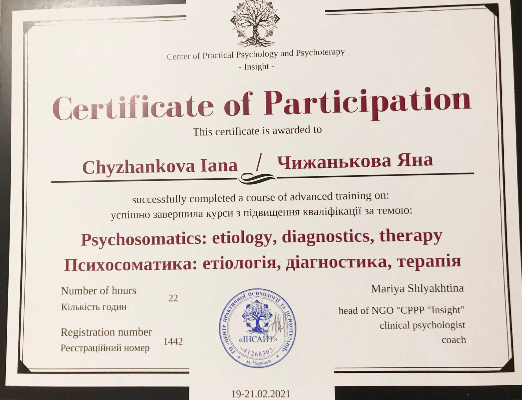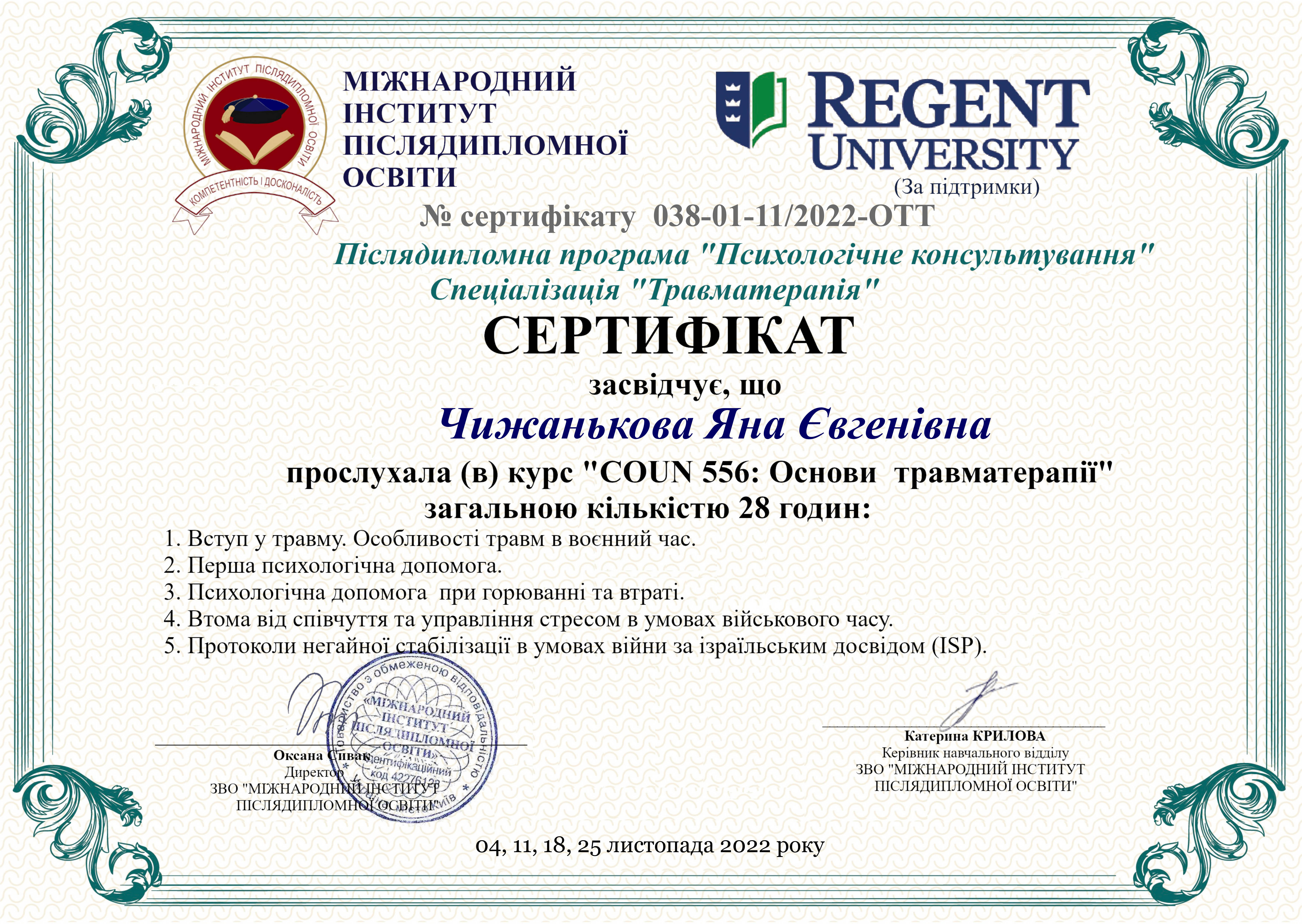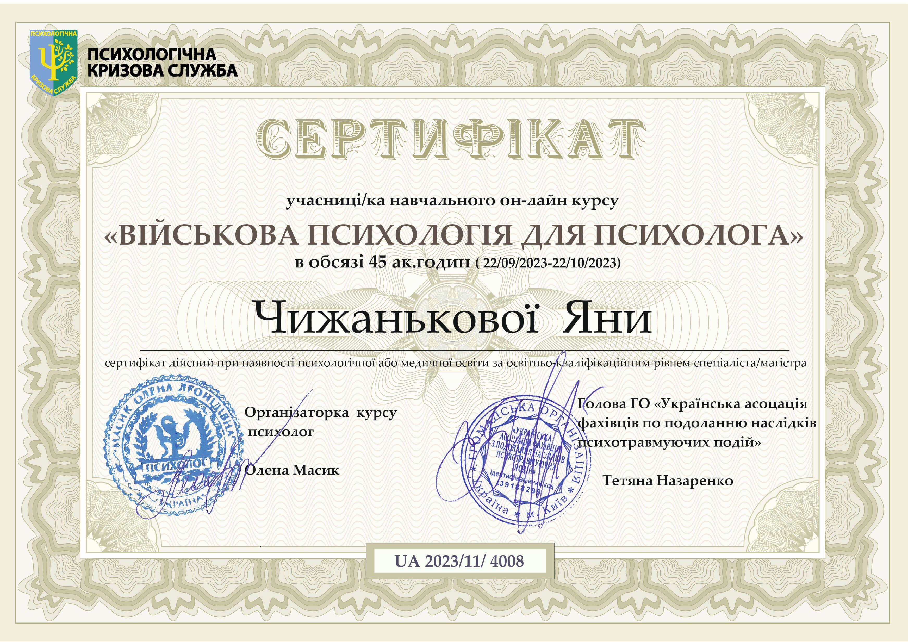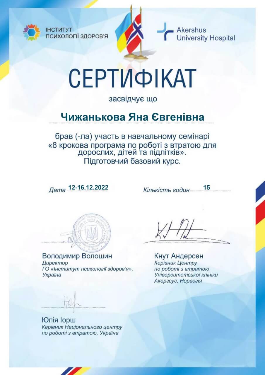 В марте 2022 года прошла кратковременный курс от международной израильской команды специалистов – International Psycho-educational Projects. И получила международный сертификат специалиста и реагирование на стресс и травмы.