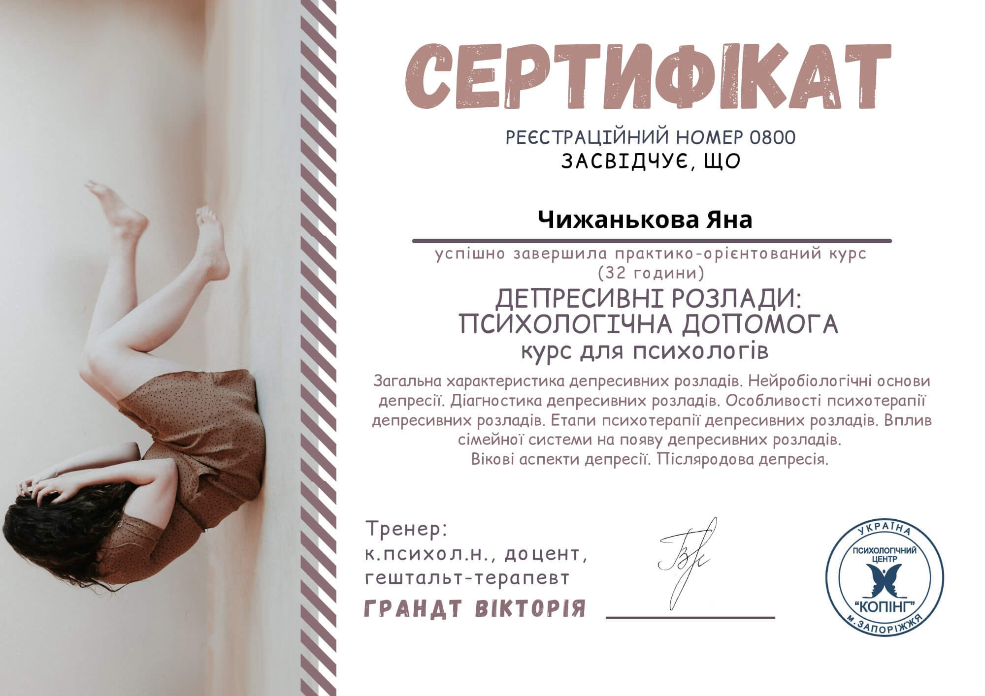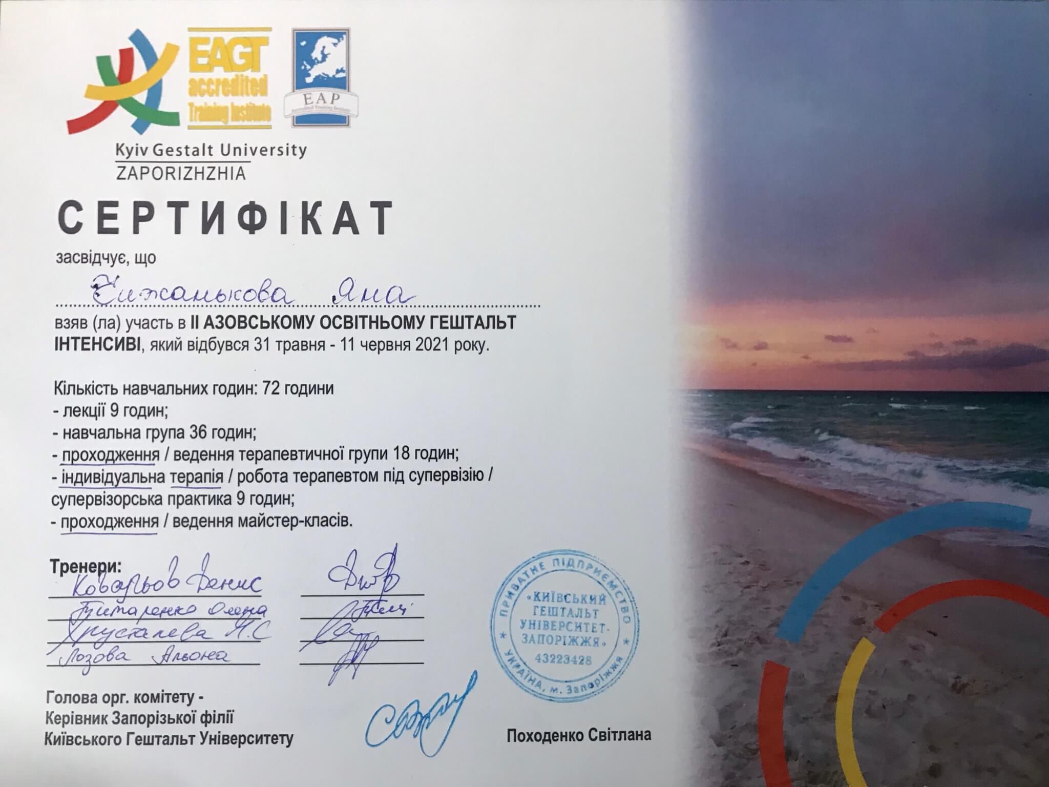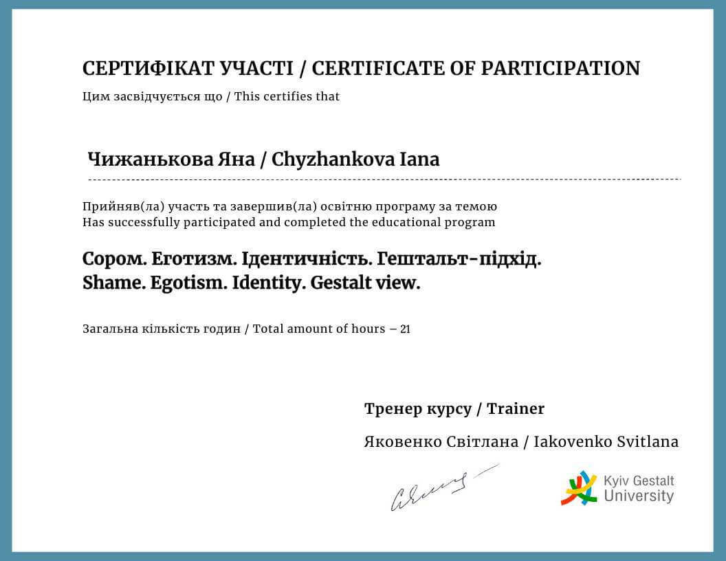 2021-2022 – Заканчиваю обучение на специализации «Работа по темам сексуальности в гештальт-подходе», которая включает психологическую помощь жертвам сексуального насилия, в Киевском Гештальт Университете».
