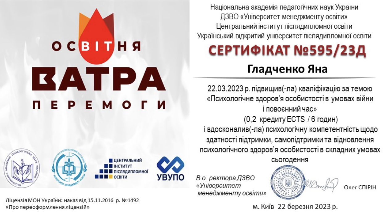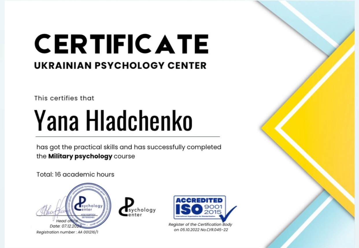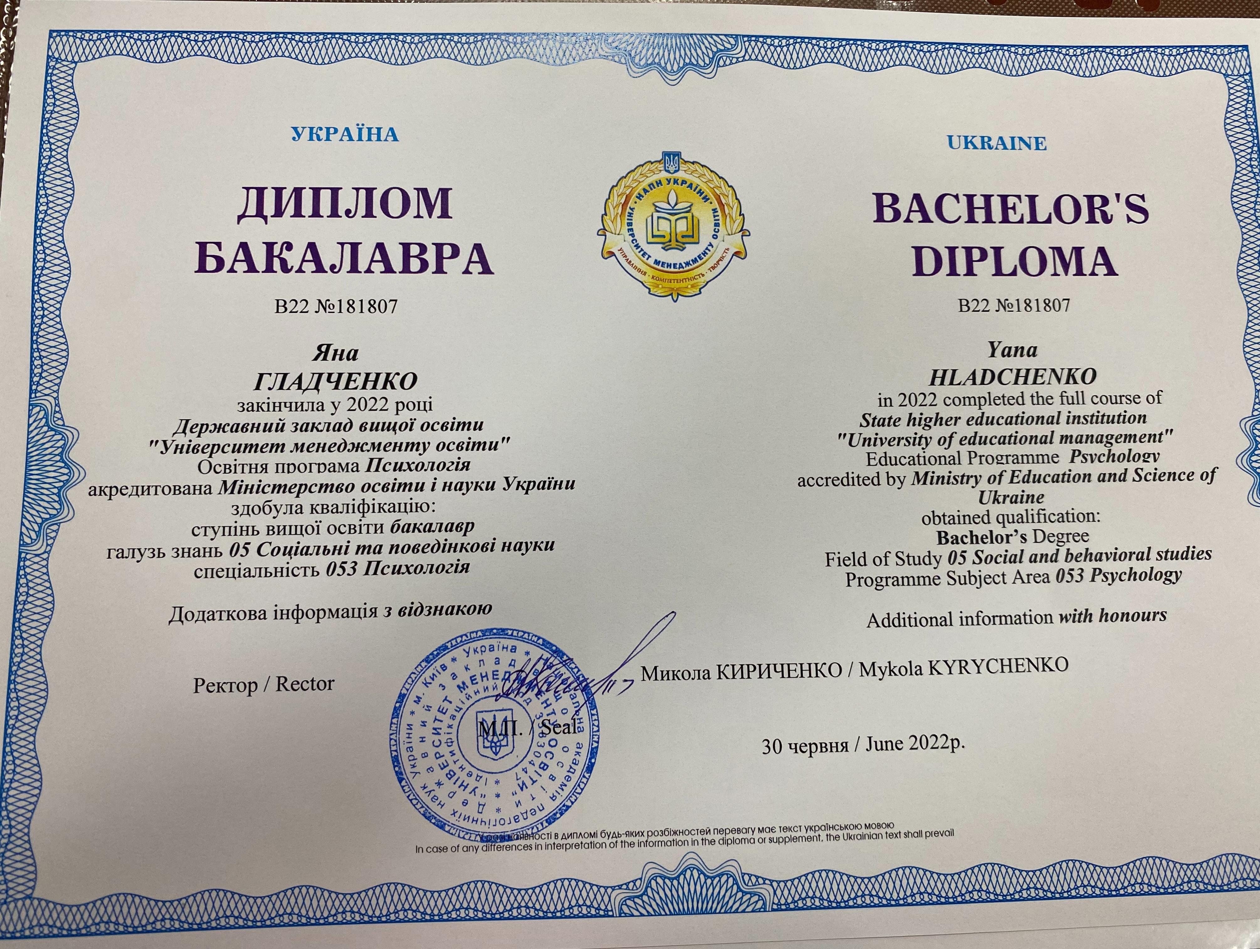 – Университет менеджмента образования (академия педагогических наук), специальность: 053 Психология (Бакалавр) – 2022 .