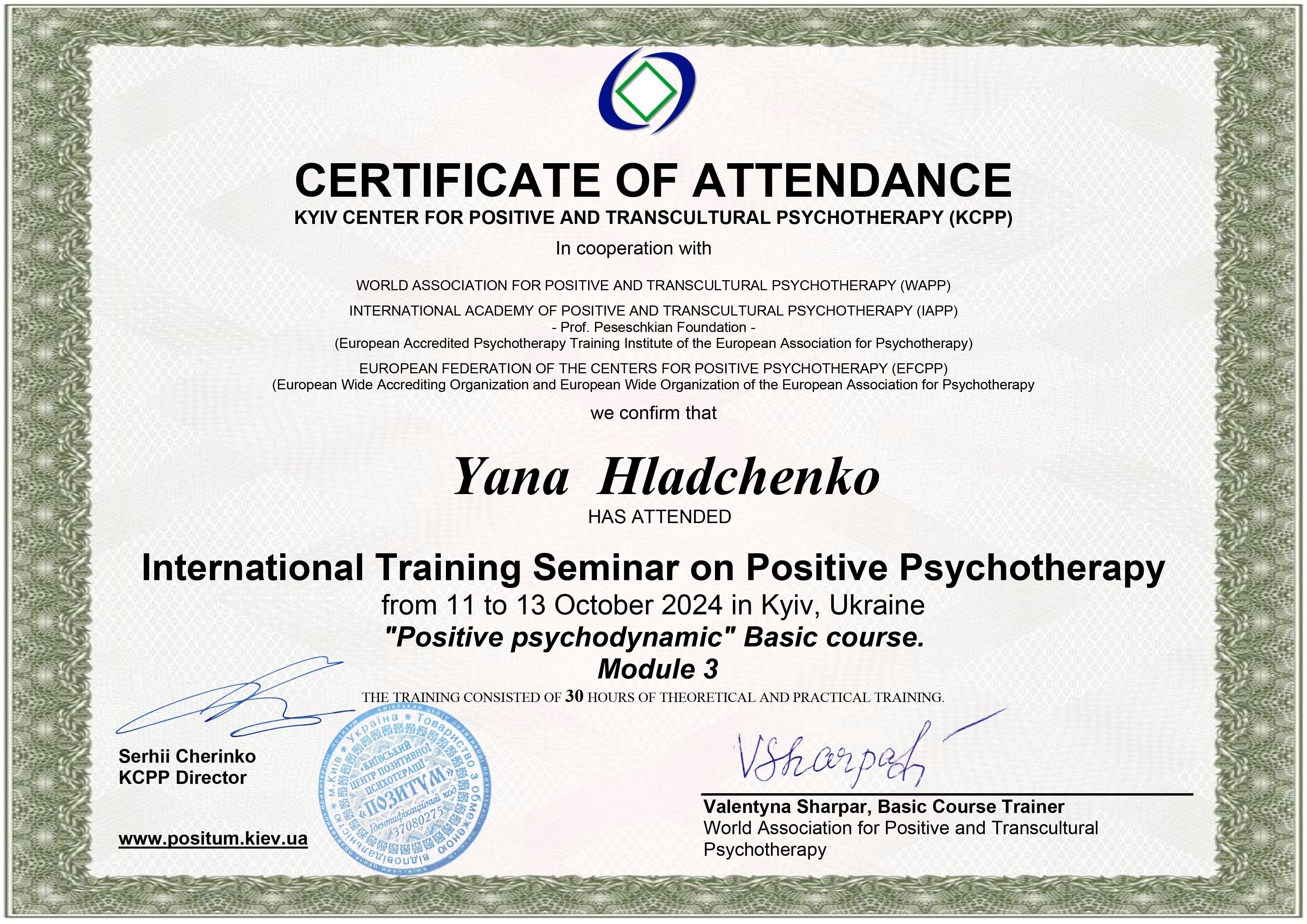 KYIV CENTER FOR POSITIVE AND TRANSCULTURAL PSYCHOTHERAPY (KCPP) июль 2024 - до сих пор .