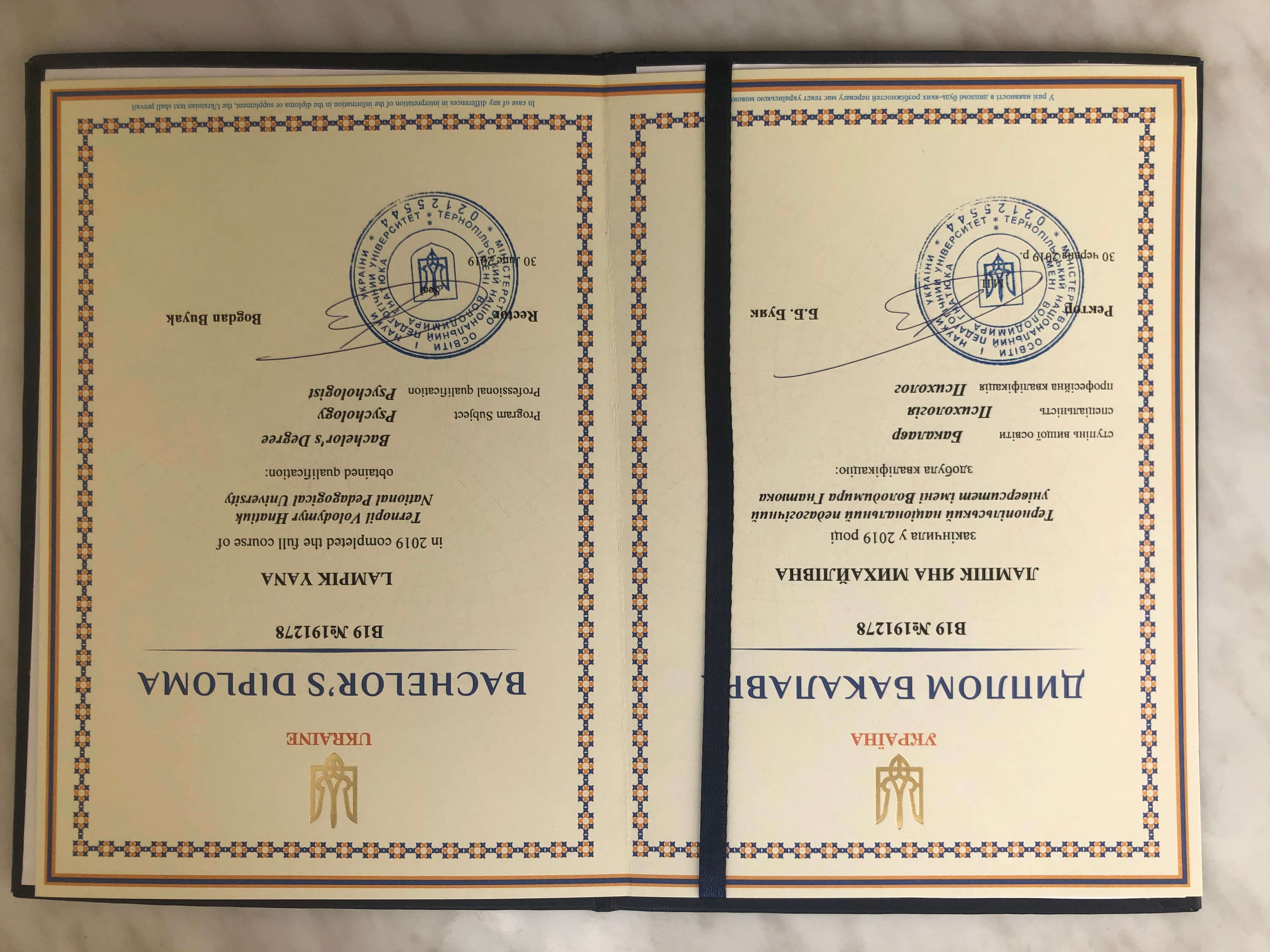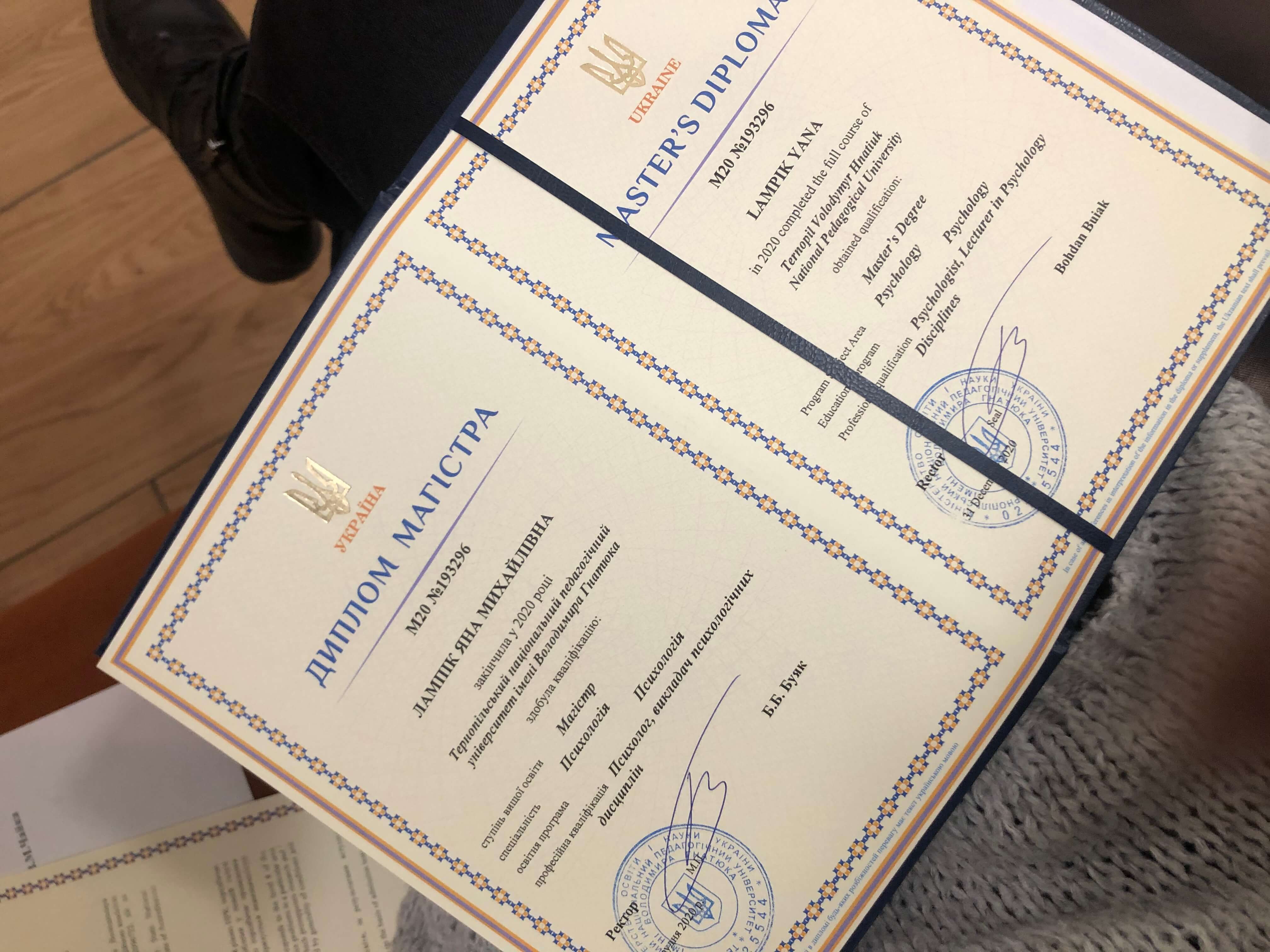 Закончила ТНПУ им. Гнатюка, специальность Психология (бакалавр+магистр). Проходила курсы арттерапии в работе с травмой, базовый курс арттерапии (Болгария, EEATA), базовый курс эмоционально-образной терапии.