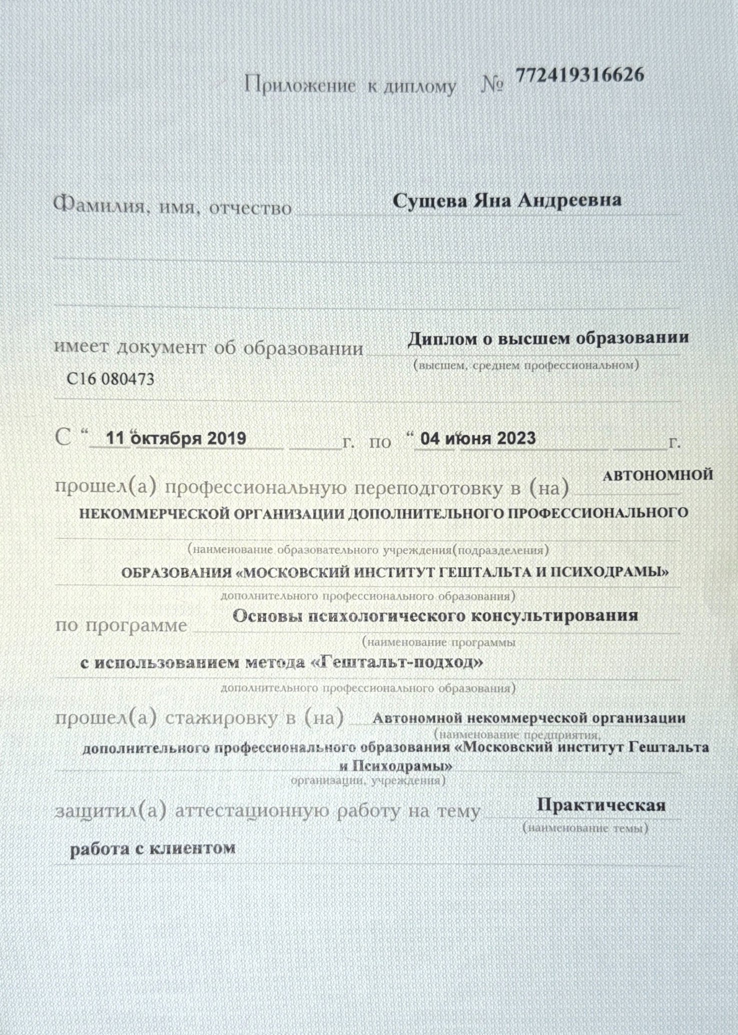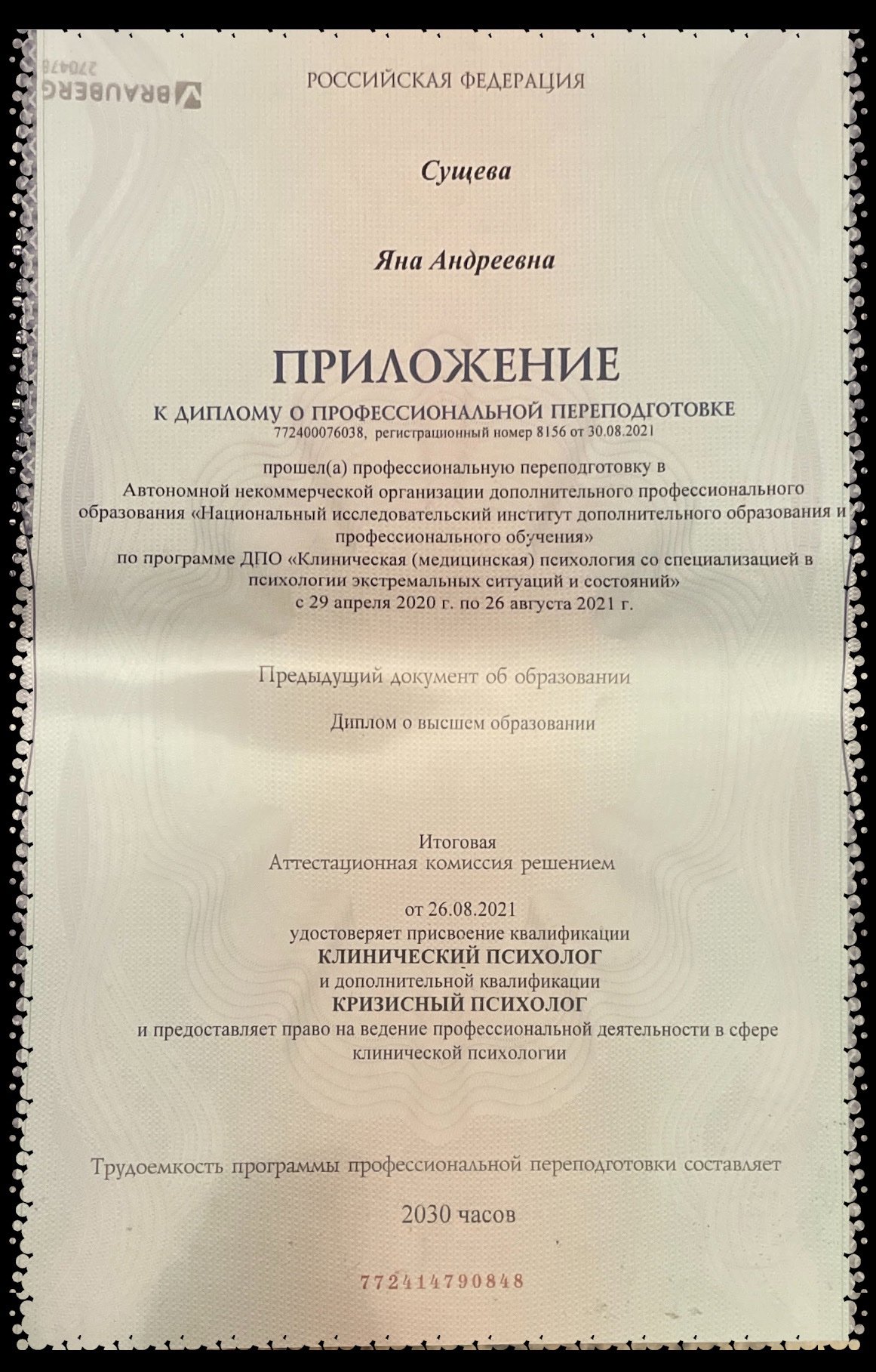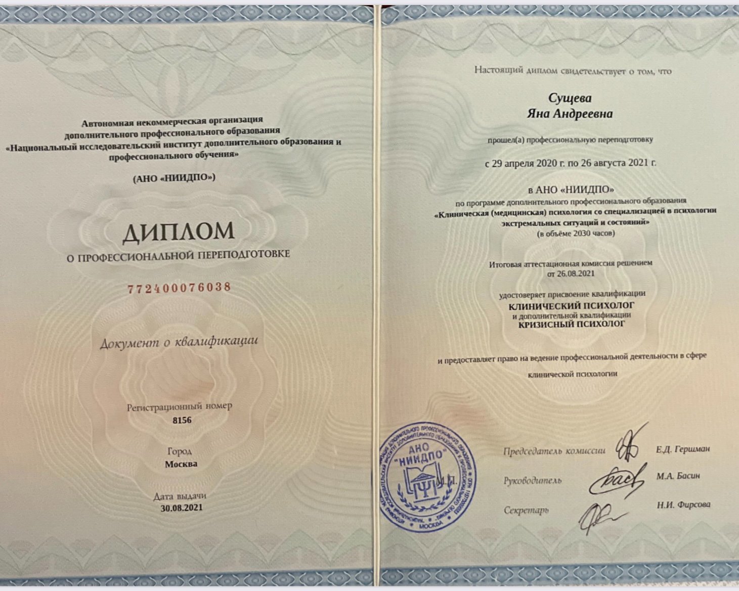 АНО "НИИДПО" (2021) специальность "Клиническая психология со специализацией в кризисных и экстремальных состояниях"