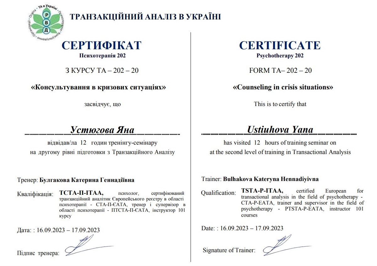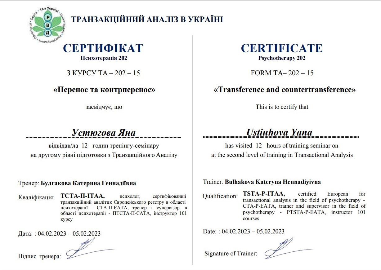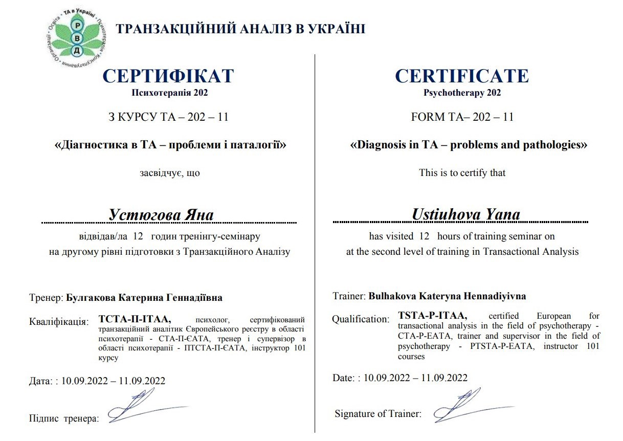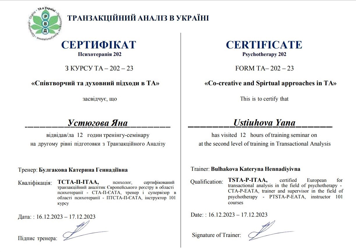 2. Украинский союз транзактного анализа, тренер Екатерина Булгакова.