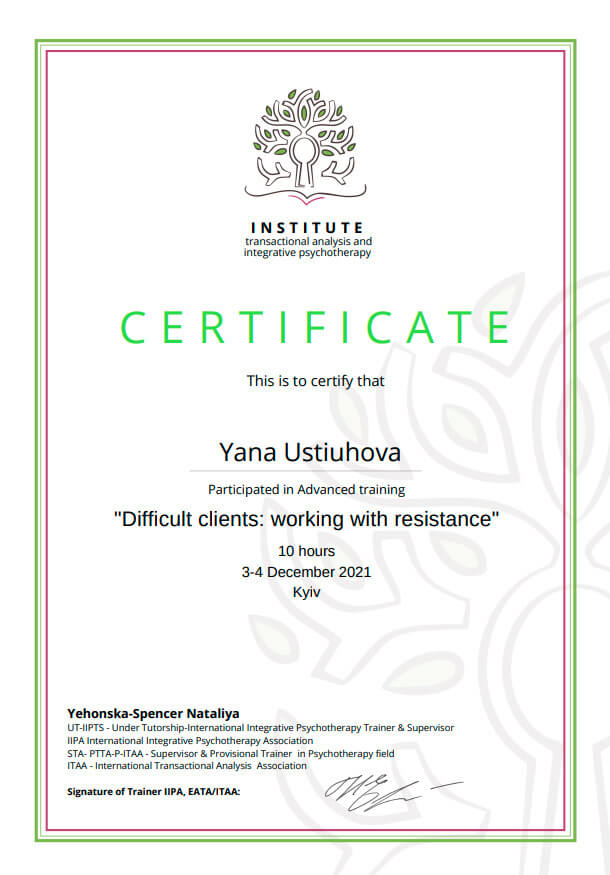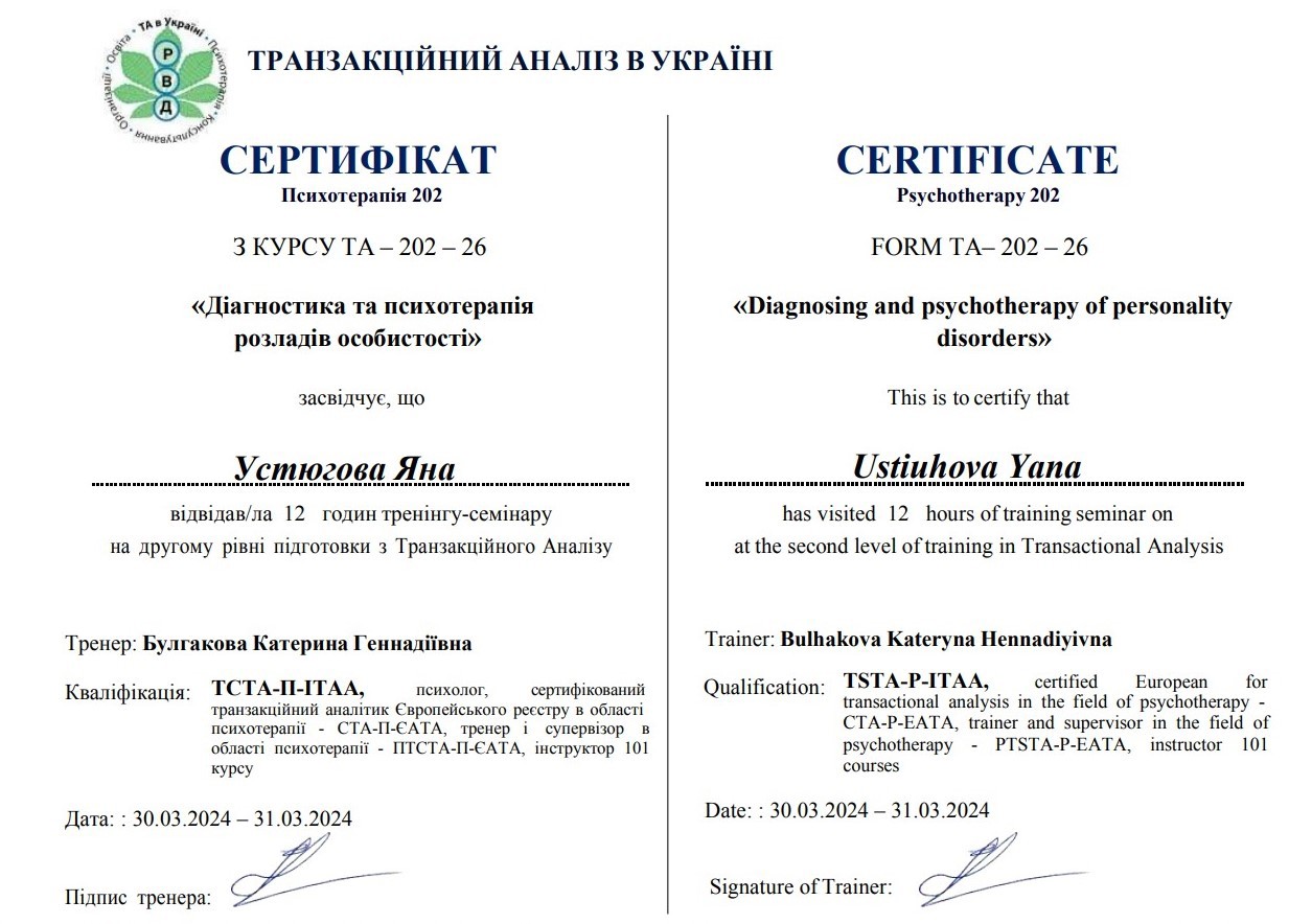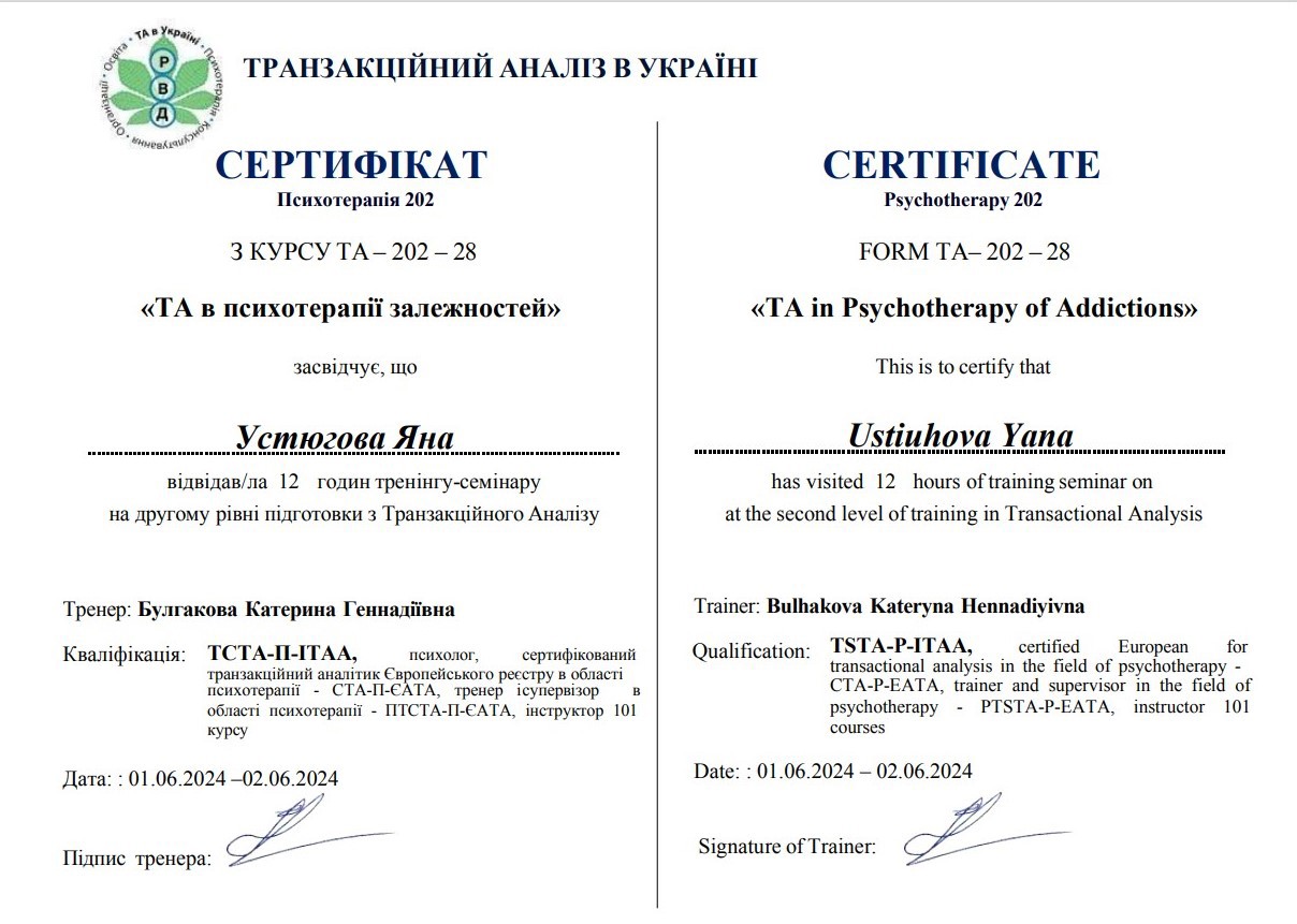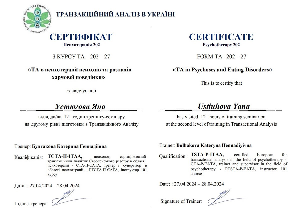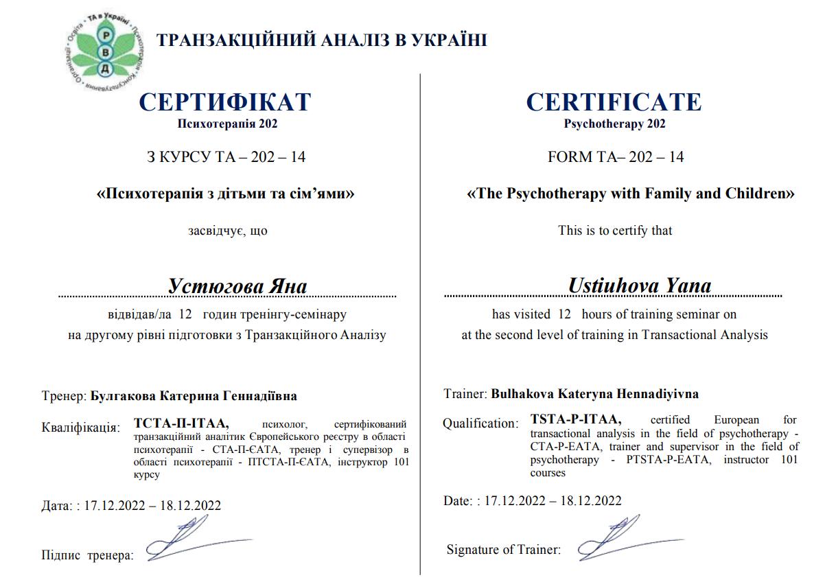 2. Украинский союз транзактного анализа, тренер Екатерина Булгакова.