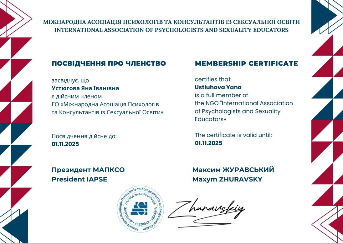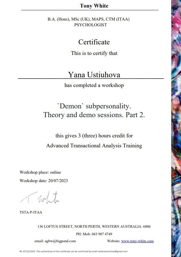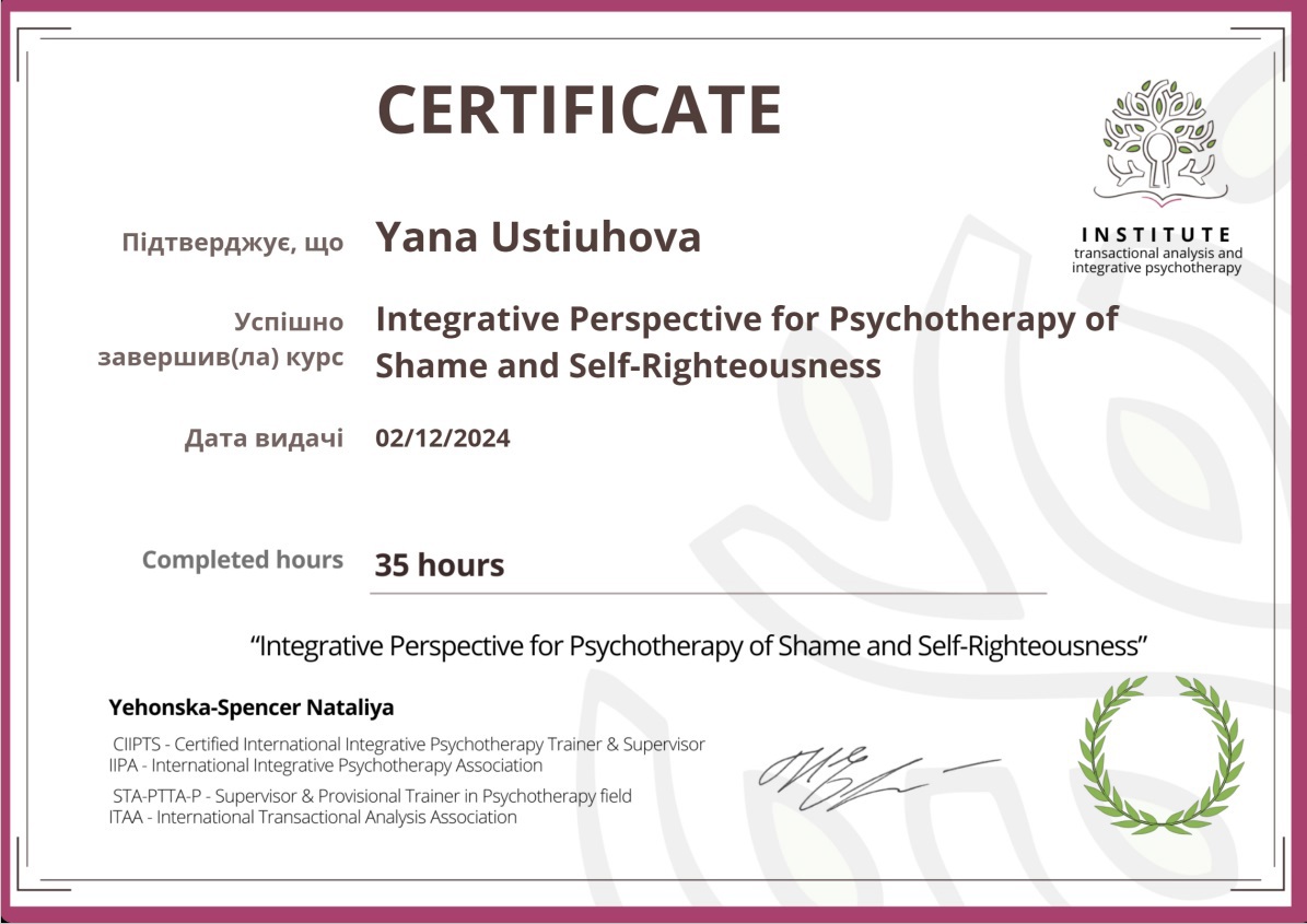 Завершено высшее образование по специальности "Практический психолог, степень - Магистр психологии. Основной психотерапевтический метод в котором работаю - транзактный анализ, а именно интегративный транзакный анализ, который подходит к решению проблем клиента комплексно, включая работу с когнитивно-поведенческой сферой, эмоциональными и телесными , поэтому помогает клиенту интегрировать всю полноту опыта, чтобы полюбить себя и чувствовать гармонию между внутренним и внешним миром.