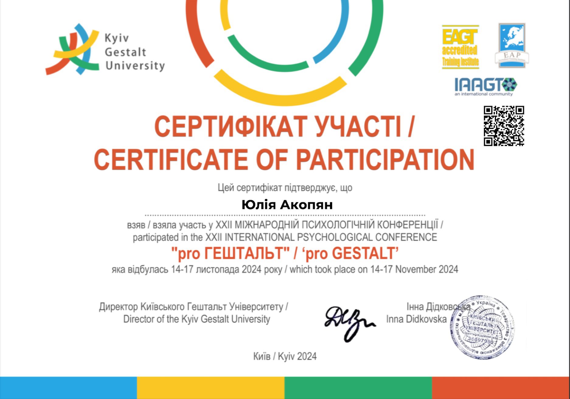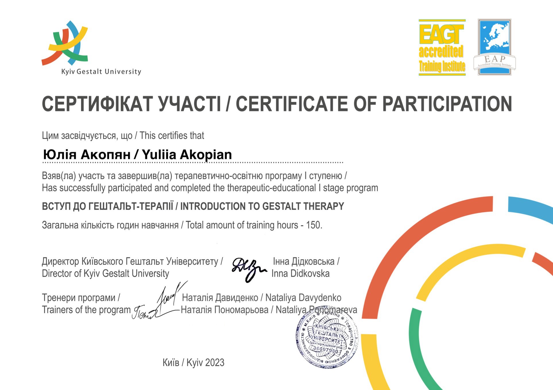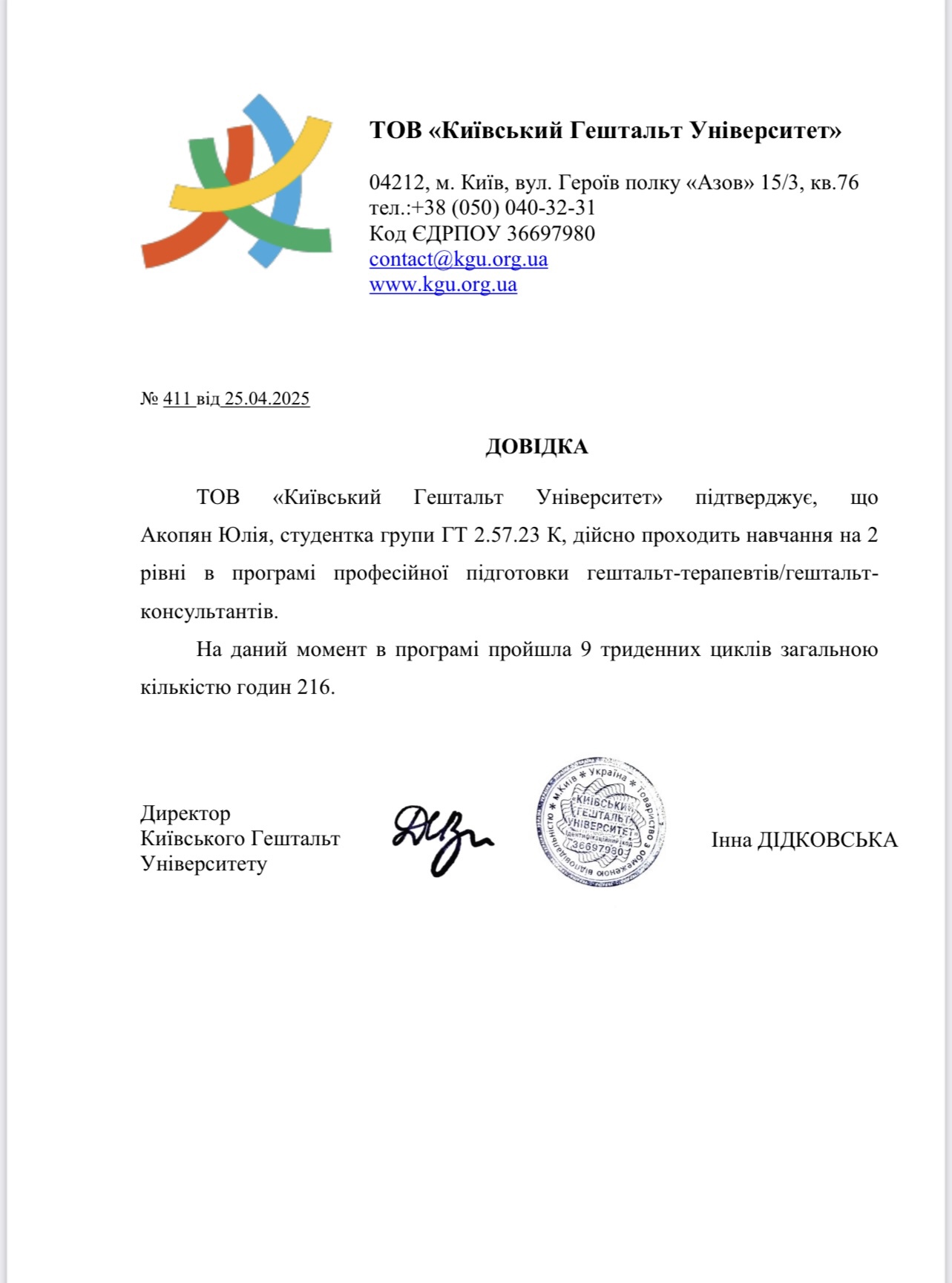 КГУ 1 и 2 степень подготовки гештальта терапевтов.