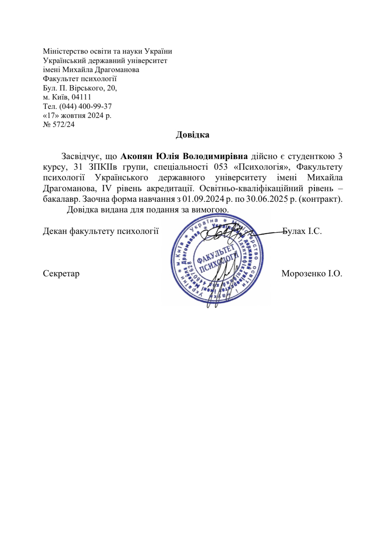 Украинский государственный университет имени М.Драгоманова – психология.
