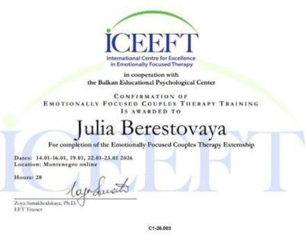Я получила диплом магистра психологии в МАУП. Прошла 3 ступени ЭОТ в центре Линде. Прошла в ХИГИП специализацию по работе с созависимостью и специализацию по работе с группами, а в МИГИС специализацию по работе с чувствами. Прохожу обучение ЭФТ для пар.