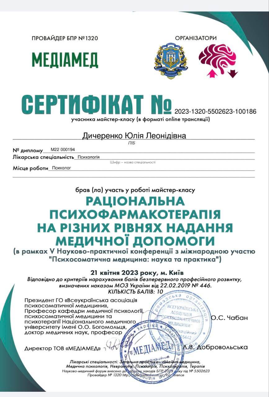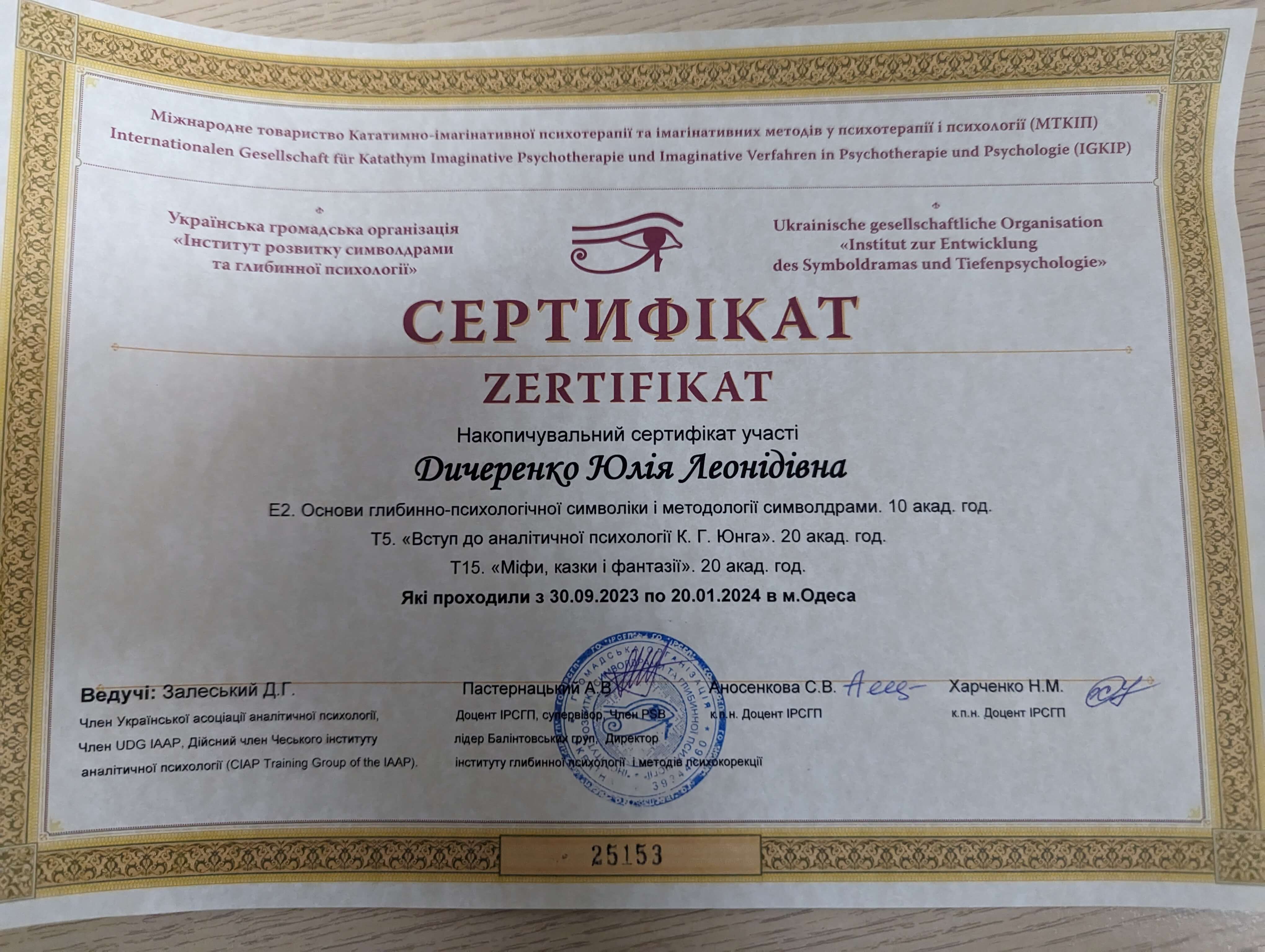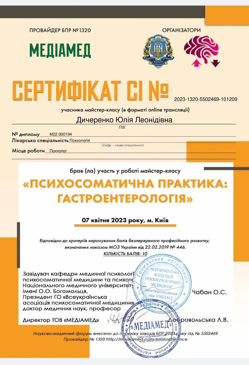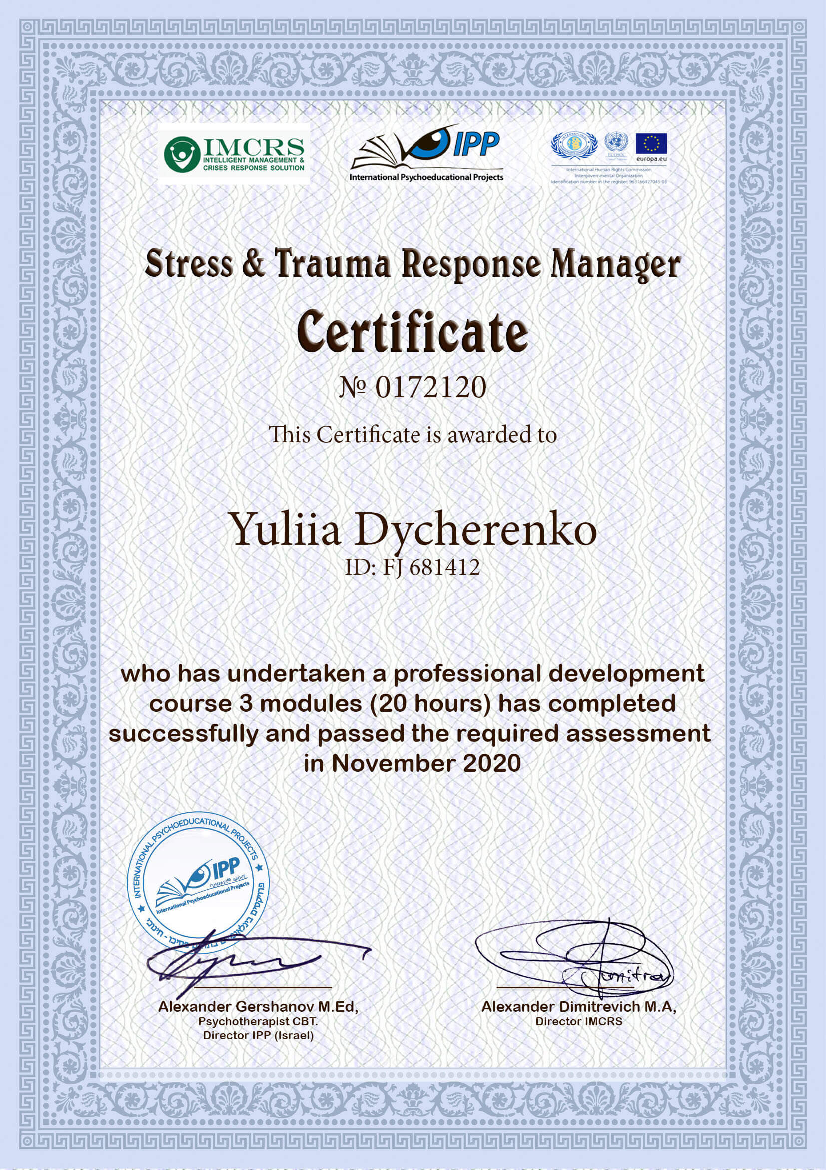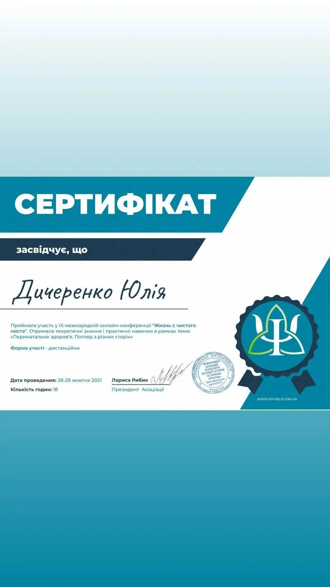 Беспрерывно учусь. Помимо основного образования в гос ВУЗе и в психодинамическом методе есть множество дополнительных обучений. За плечами курсы по консультированию в КПТ подходе, курсы по работе с беременными и молодыми мамами, множество конференций как в психотерапевтическом направлении, так и от психиатров для психотерапевтов. Обучение по работе с РПП, психосоматическими заболеваниями, кризисная психология и респондерская помощь. Курсы по работе с расстройствами связанными со стрессом.