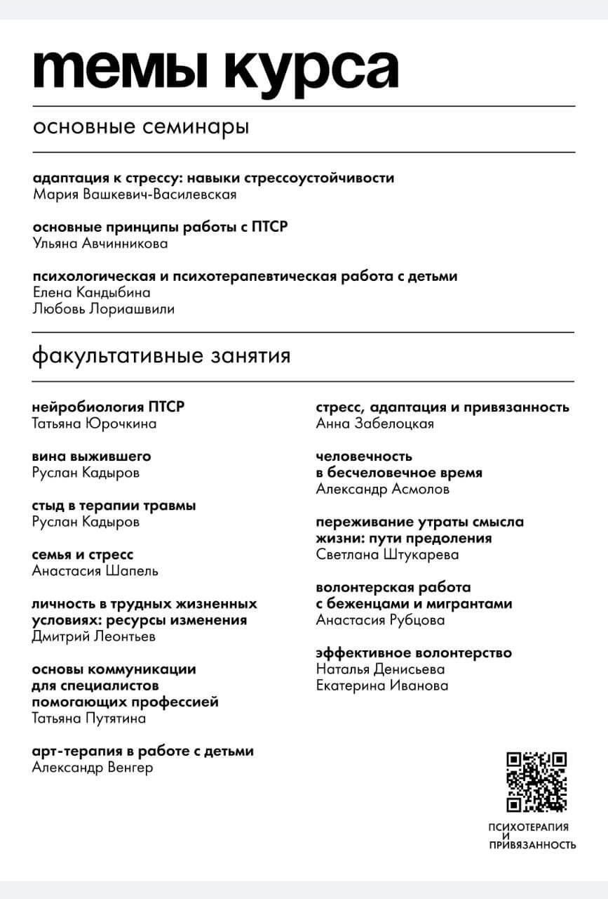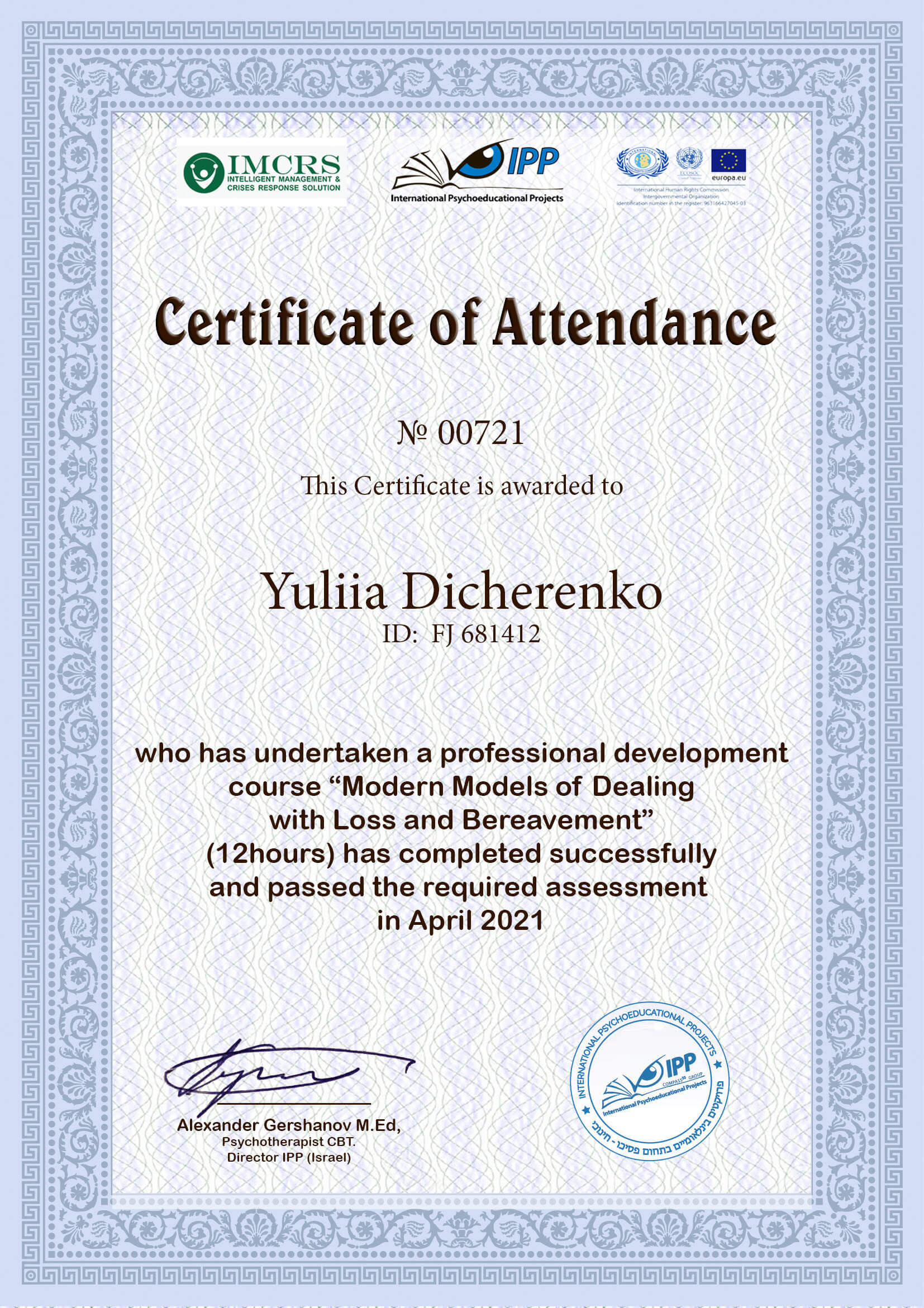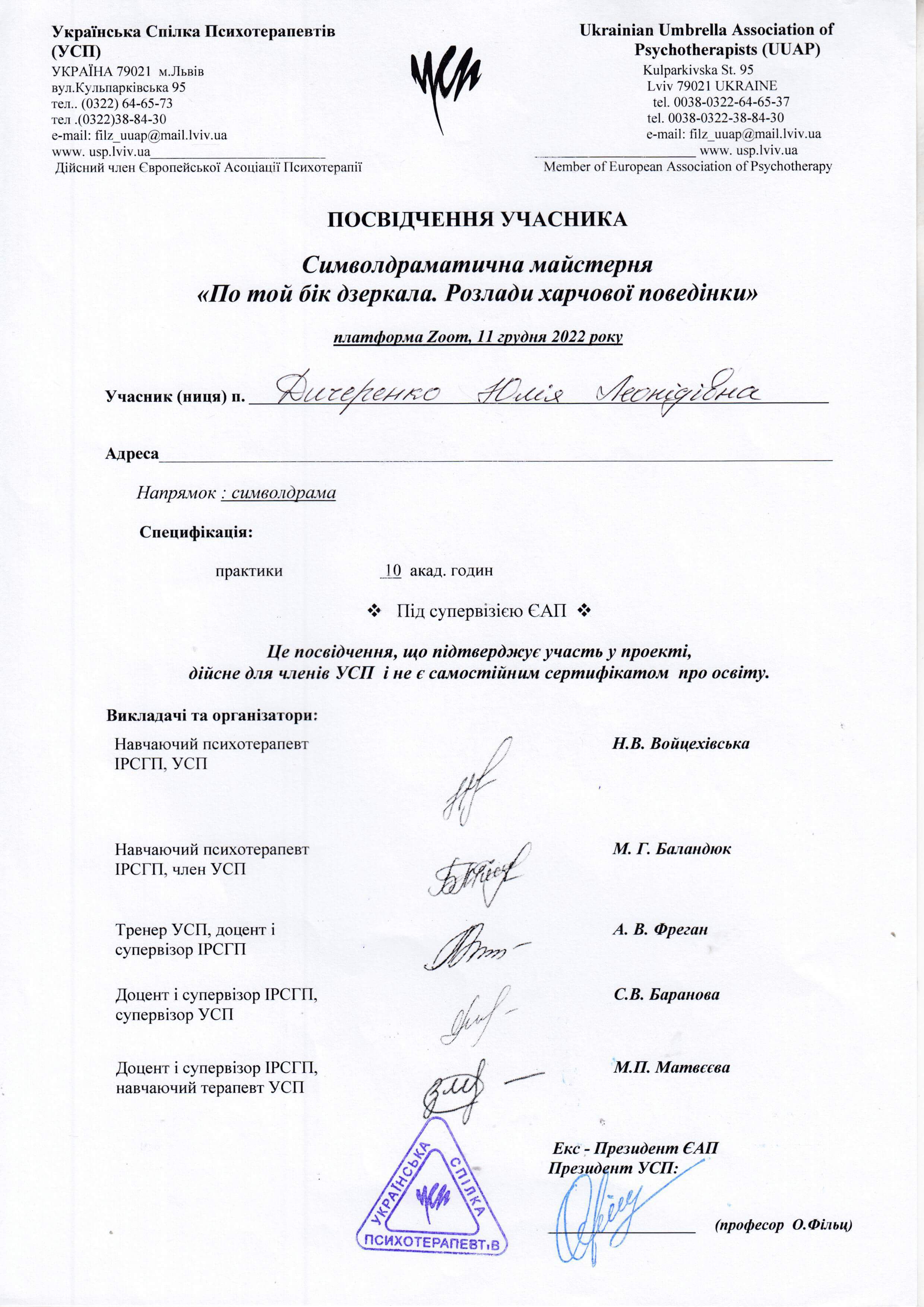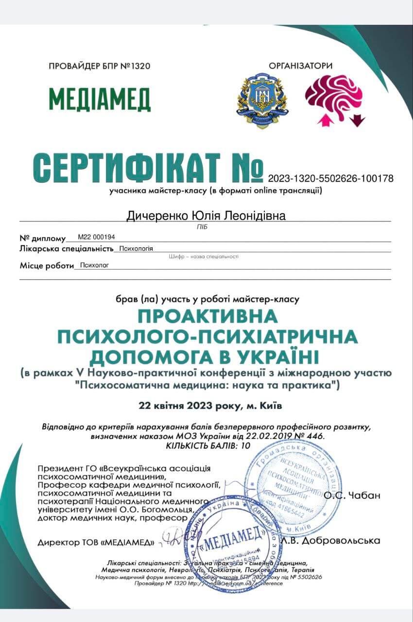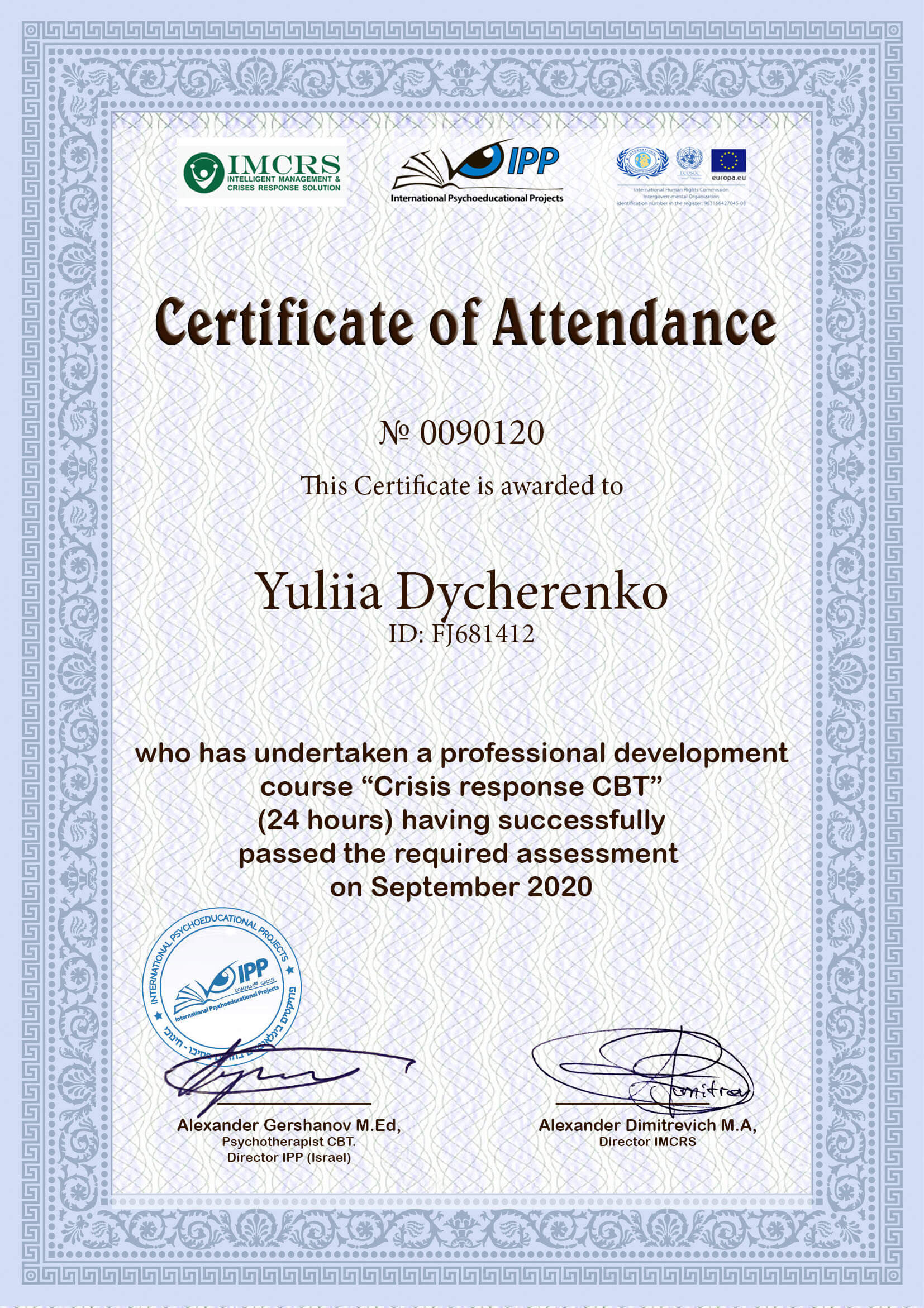 Беспрерывно учусь. Помимо основного образования в гос ВУЗе и в психодинамическом методе есть множество дополнительных обучений. За плечами курсы по консультированию в КПТ подходе, курсы по работе с беременными и молодыми мамами, множество конференций как в психотерапевтическом направлении, так и от психиатров для психотерапевтов. Обучение по работе с РПП, психосоматическими заболеваниями, кризисная психология и респондерская помощь. Курсы по работе с расстройствами связанными со стрессом.