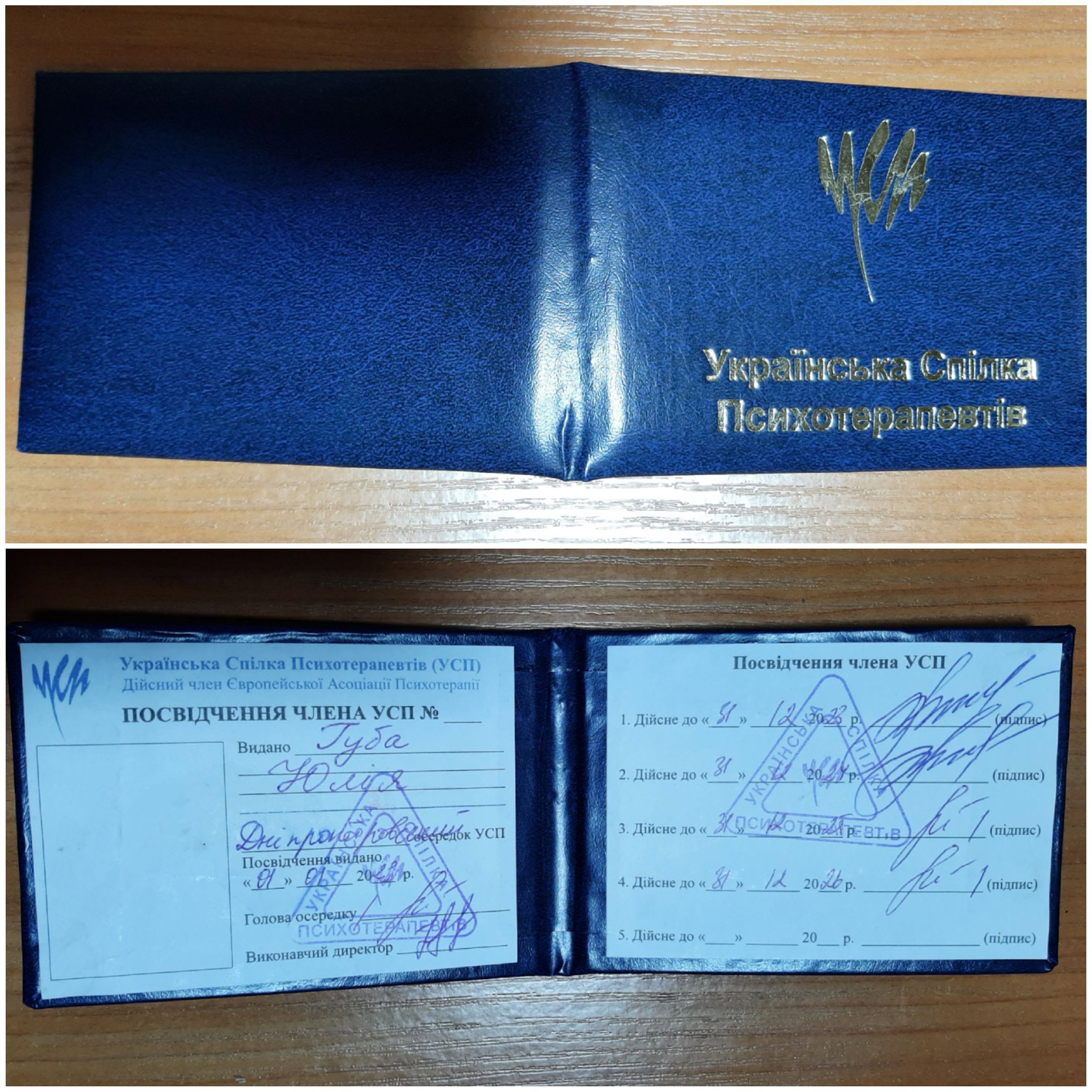 Ноябрь 2023 г. – Совместный симпозиум УСП (Украинского Союза психотерапевтов), ЕАР и NAO Чешской республики, повышение квалификации по психотерапии, сертификат.