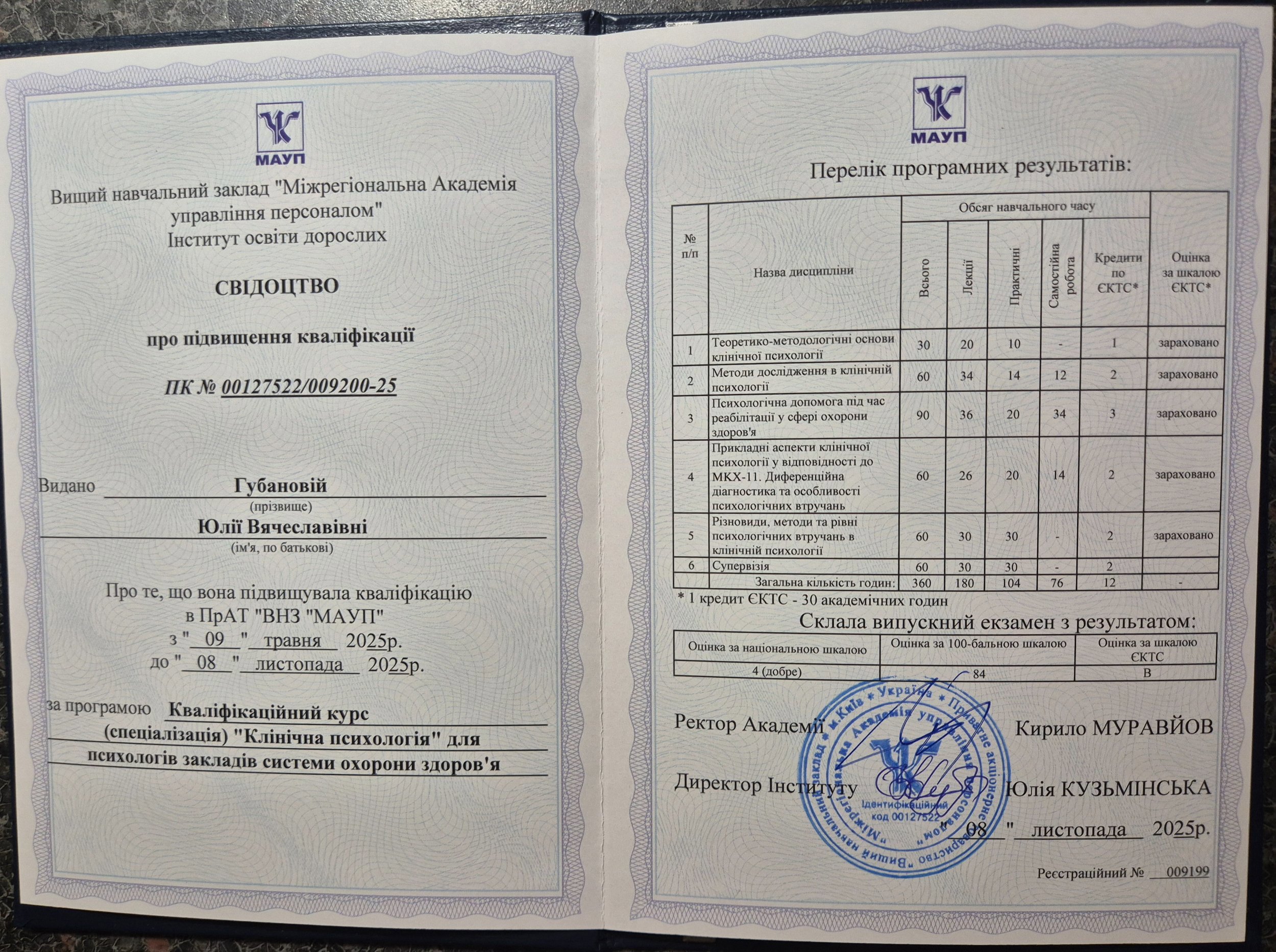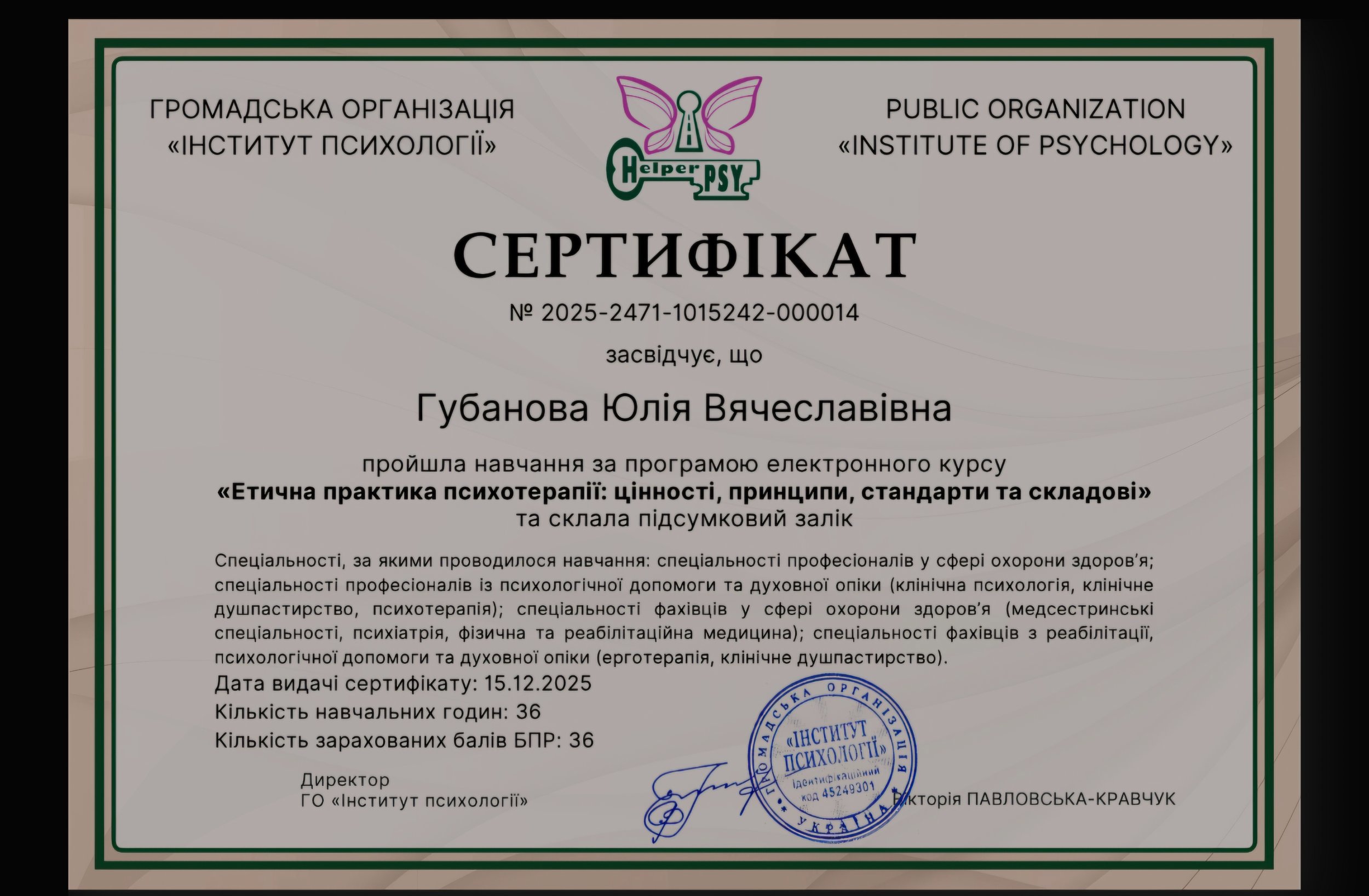 Киевский государственный университет им Т.Г.Шевченко; Открытый Международный университет развития человека "Украина"; Висбаденская Академия Транскультуральной Позитивной психотерапии; Межрегиональный институт гештальт-терапии и искусства; Открытый институт психоанализа