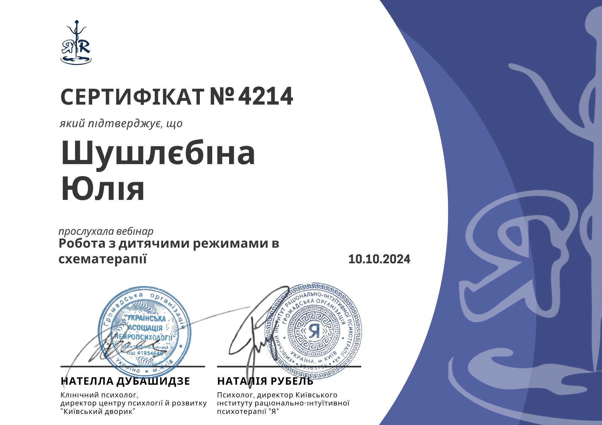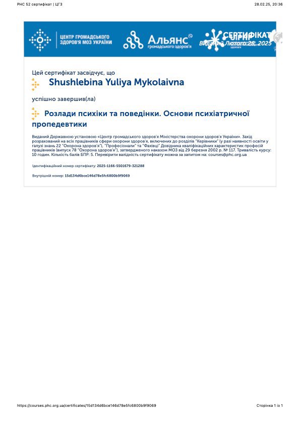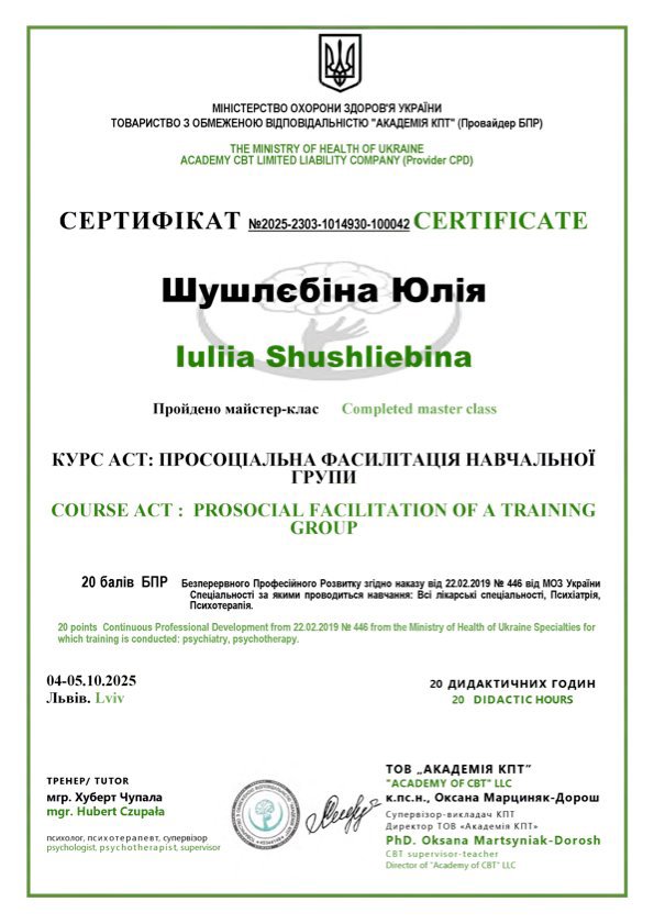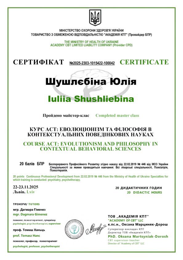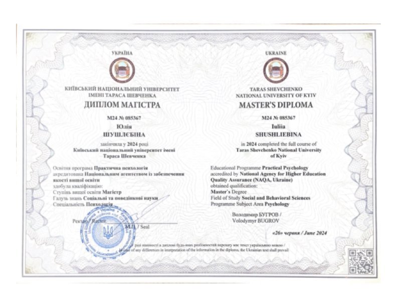 Окончила магистратуру Киевского национального университета им. Шевченко по специальности Психология сейчас учусь в Академии КПТ на программе терапии принятия и ответственности