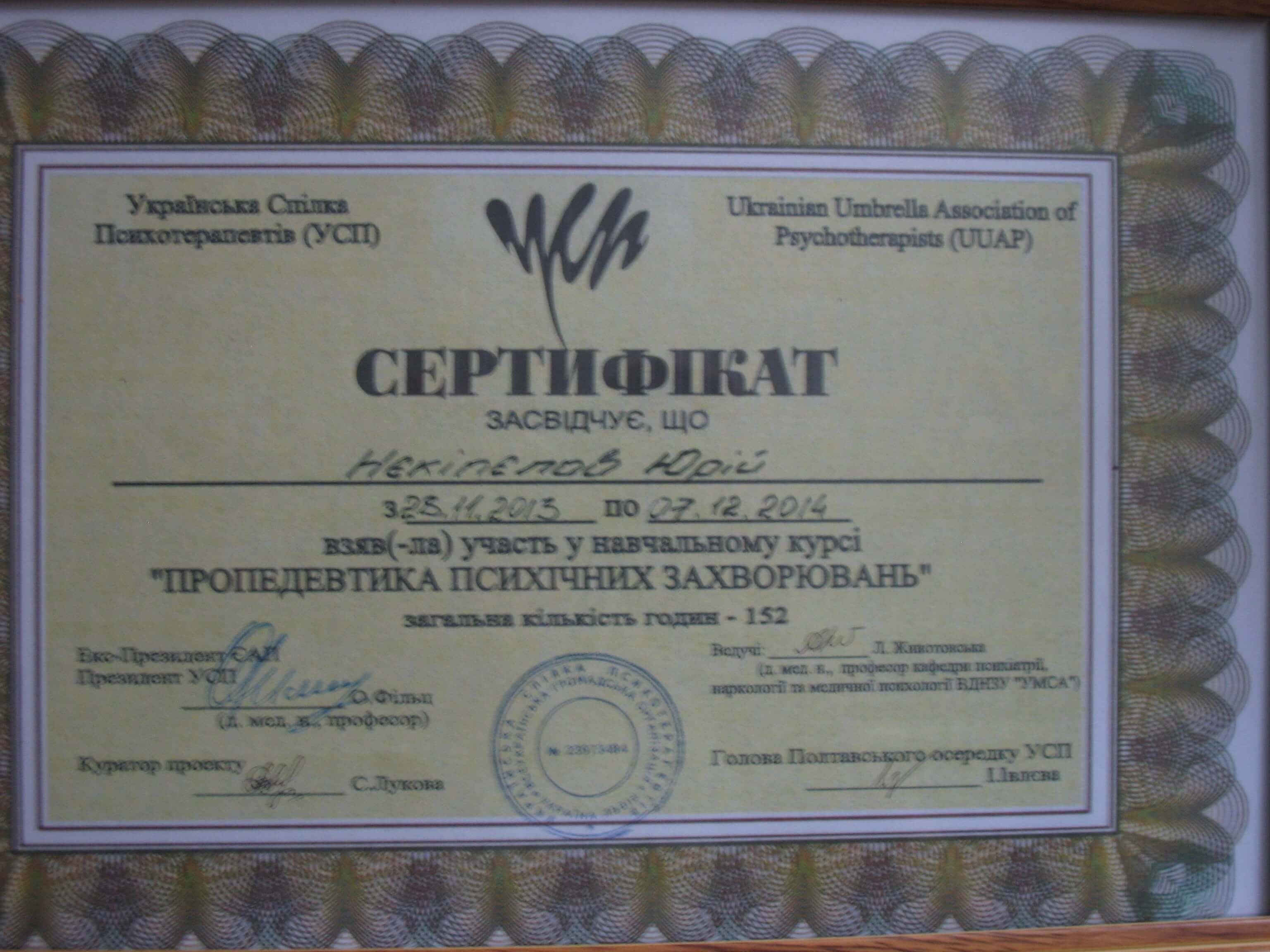 Психолог (Полтавский национальный педагогический университет им.В.Г.Короленко), сертифицированный семейный консультант в методе положительной психотерапии (WAPP, Германия), сертифицированный коуч по специализациям "лайф-коучинг" и "коучинг здоровья" (Международный институт коучинга я (WAPP, Германия), сертифицированный положительный психотерапевт (WAPP, Германия).