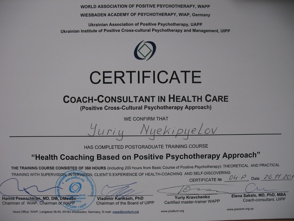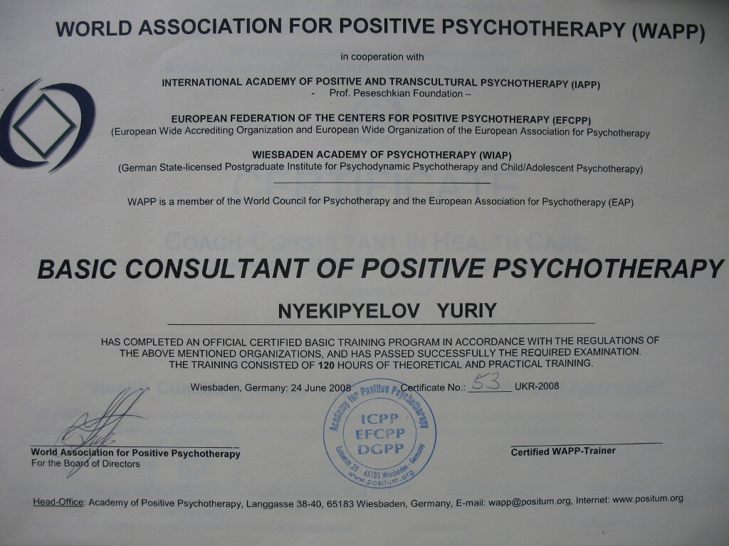 WORLD ASSOCIATION OF POSITIVE PSYCHOTHERAPY, WAPP; WIESBADEN ACADEMY OF PSYCHOTHERAPY, WIAP, Germany; Ukrainian Association of Positive Psychotherapy, UAPP; Ukrainian Institute of Positive Cross-cultural Psychotherapy and Management, UIPP